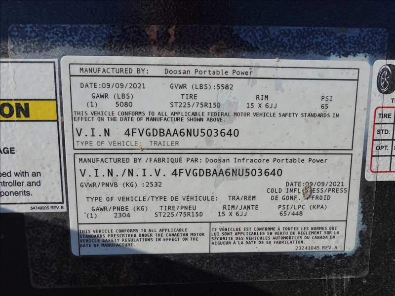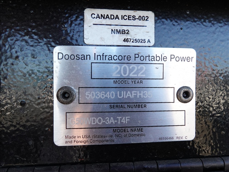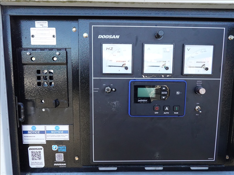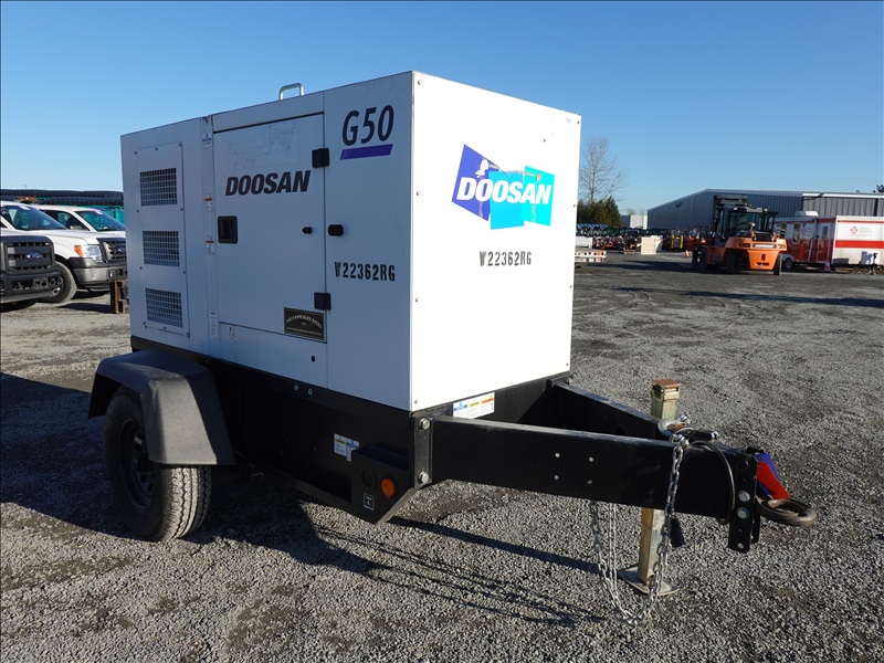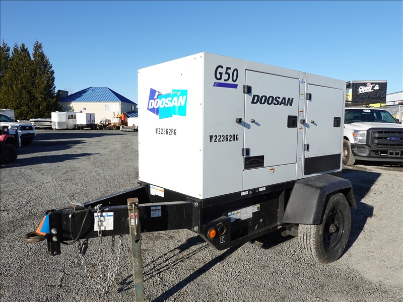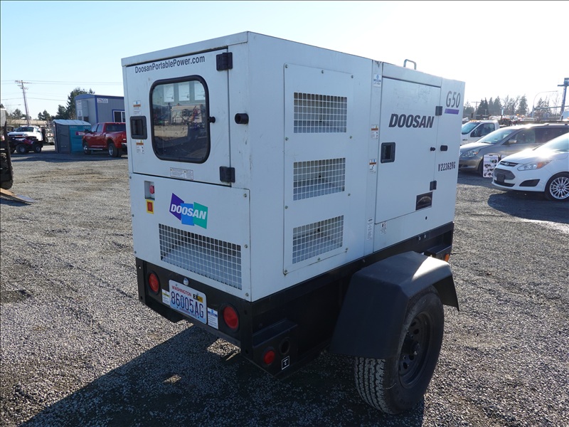 S/A, 48 KVA TRAILER MOUNTED GENERATOR, DOOSAN 4 CYL DIESEL ENGINE, 120/208/240/480V, SINGLE OR 3 PHASE, ELECT BRAKES, 225/75R15, HOUR METER READS: 3M337