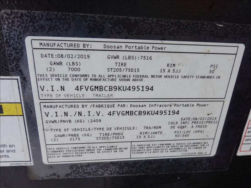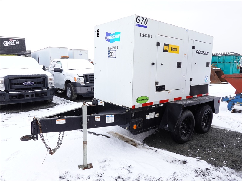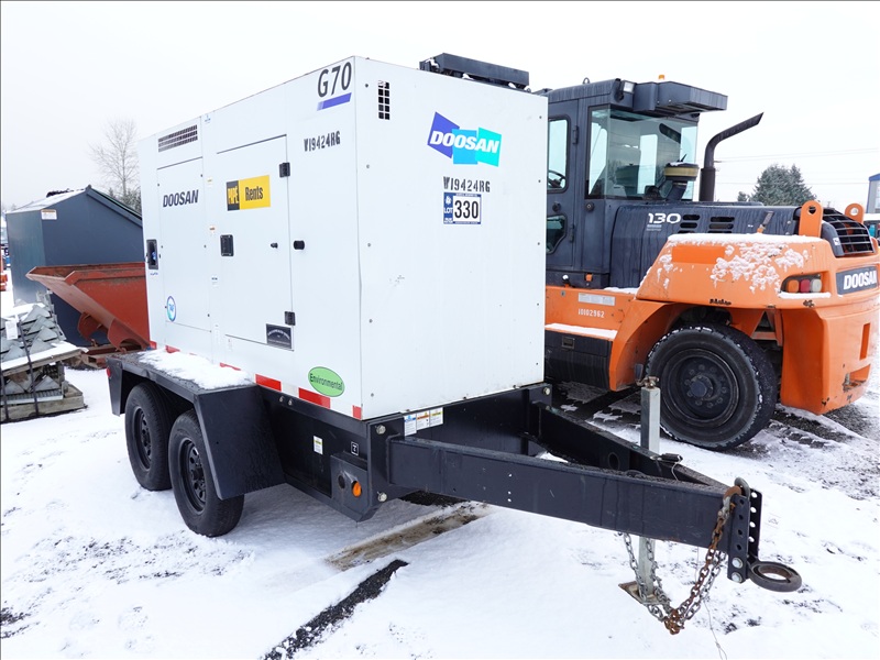 T/A, 70 KVA TRAILER MOUNTED GENERATOR, DOOSAY 4 CYL DIESEL, 120/208/240/480V, SINGLE OR 3 PHASE, ELECT BRAKES, HOUR METER READS: 4,019
