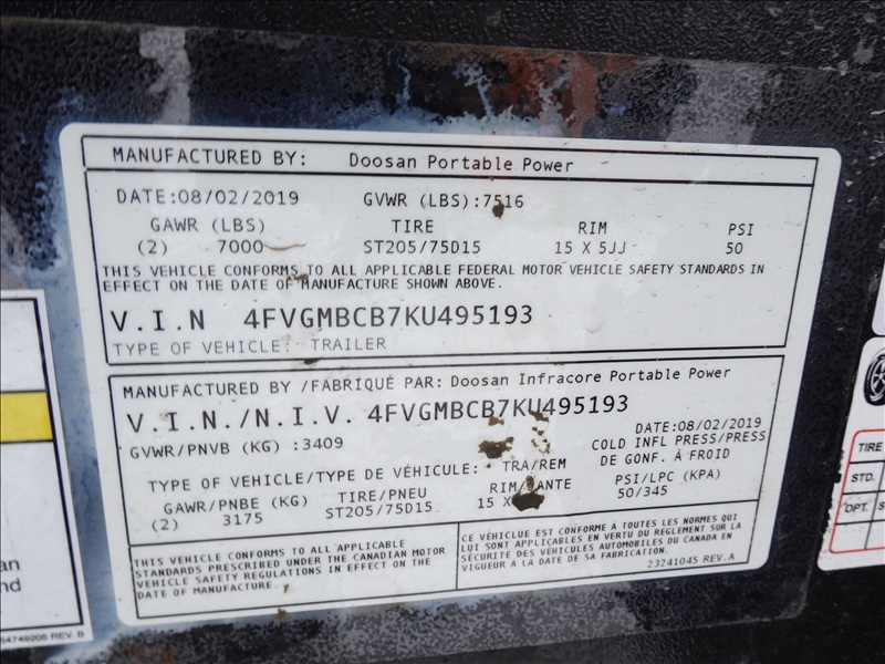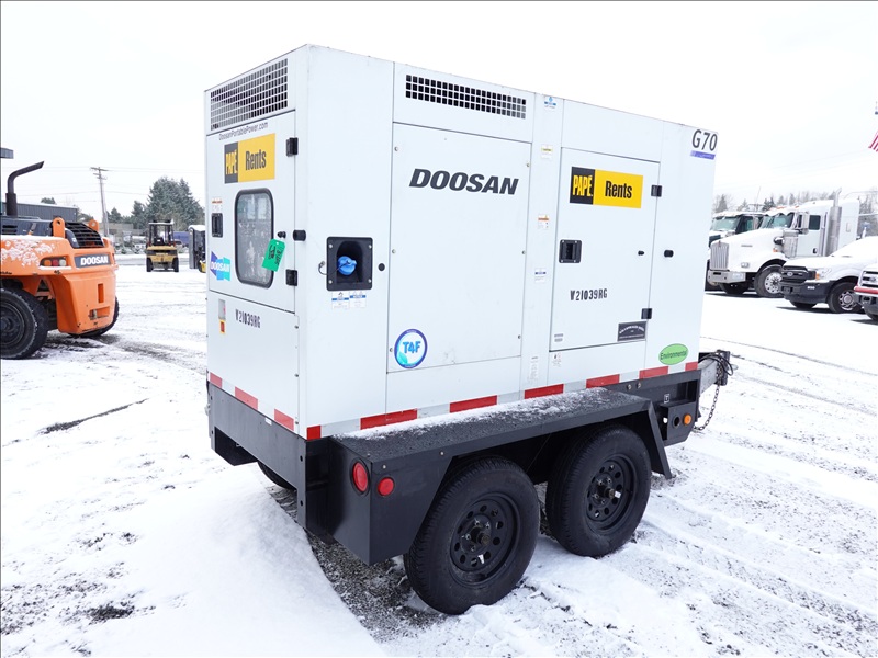 T/A, 70 KVA TRAILER MOUNTED GENERATOR, DOOSAY 4 CYL DIESEL, 120/208/240/480V, SINGLE OR 3 PHASE, ELECT BRAKES, HOUR METER READS: 7,701