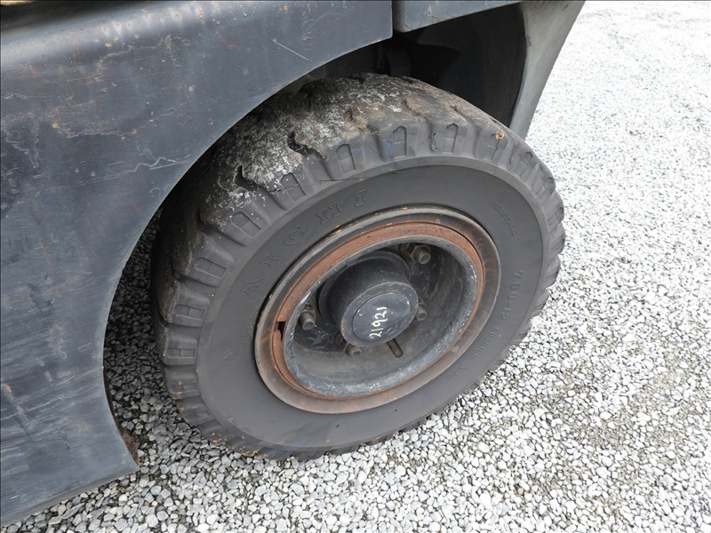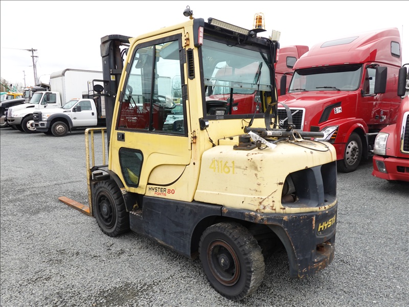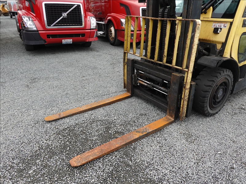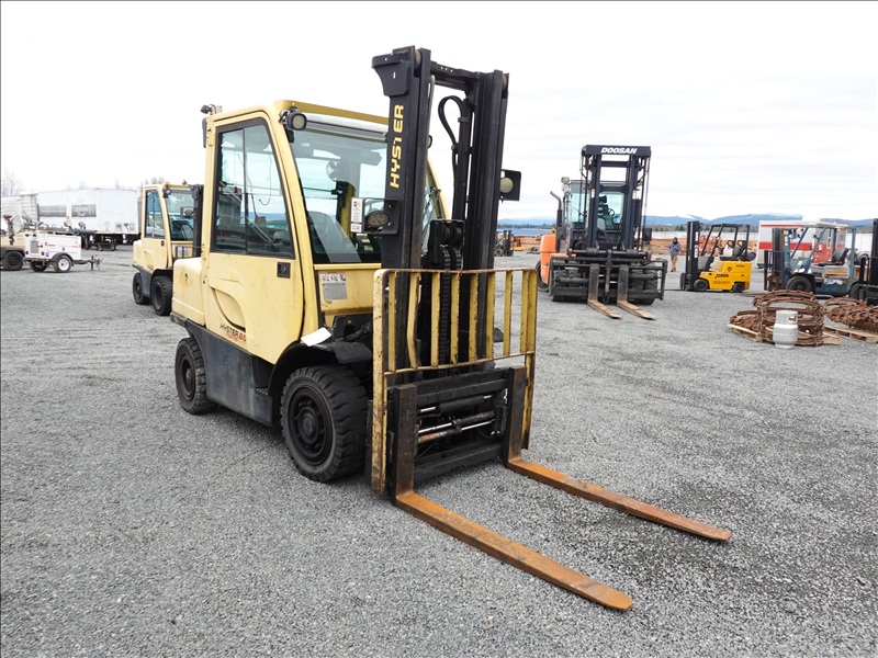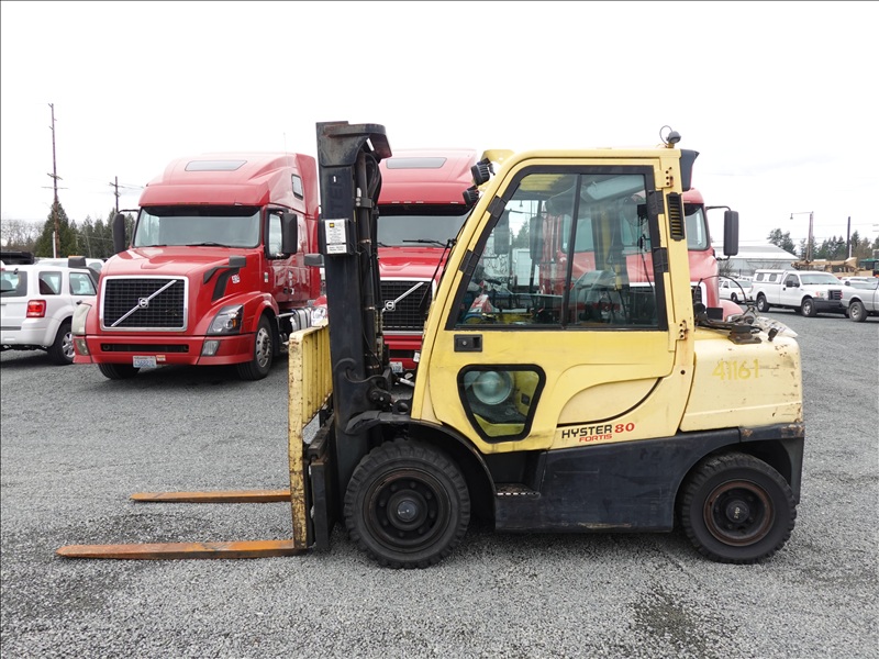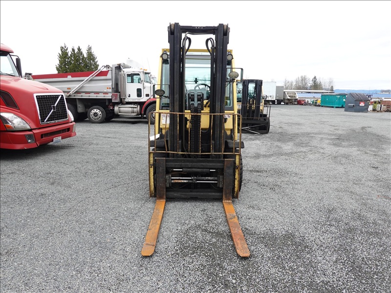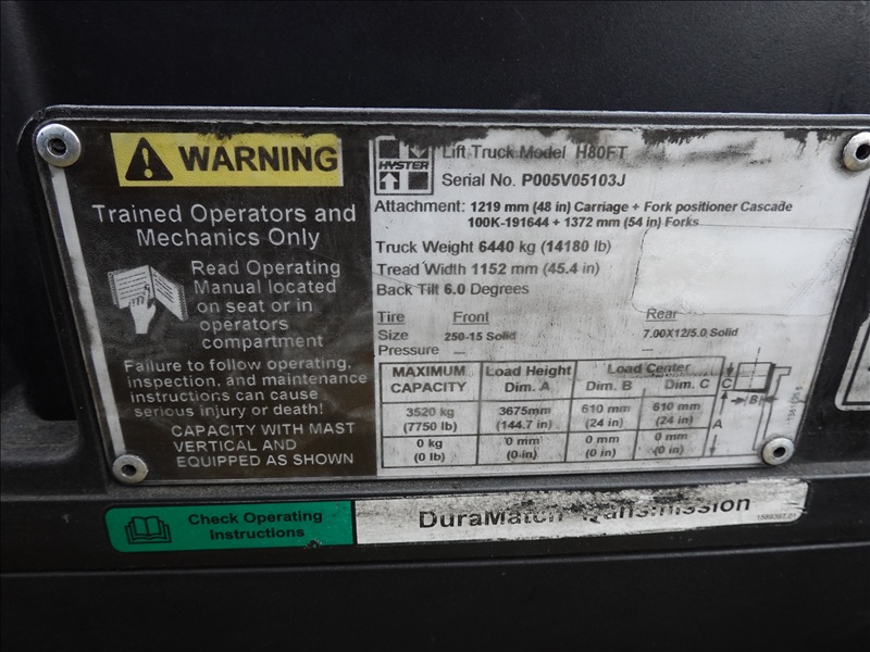 7,750 LB SOLID TIRE FORKLIFT, 144" FORK HEIGHT, 2-STAGE MAST, SIDE SHIFT, FORK POSITIONER, FTC, 6 CYL LPG, CAB (HOUR METER READS: N/A, ENGINE/WIRING DISMANTLED, OPERATING CONDITION UNKNOWN)
