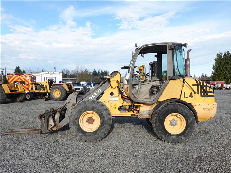 WHEEL LOADER, 58 HP D3DCBE2, HYDROSTATIC, AUX HYD, FORK ATTACHMENT, CAB, 405/70RT8, HOUR METER READS: 9,349 (NO BUCKET)