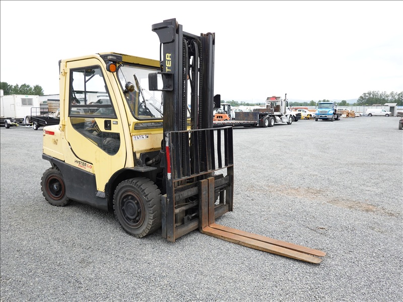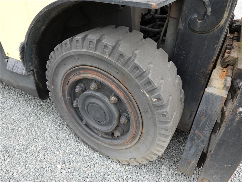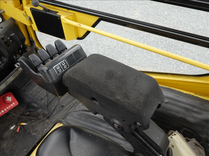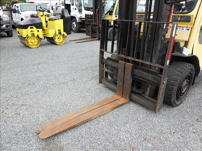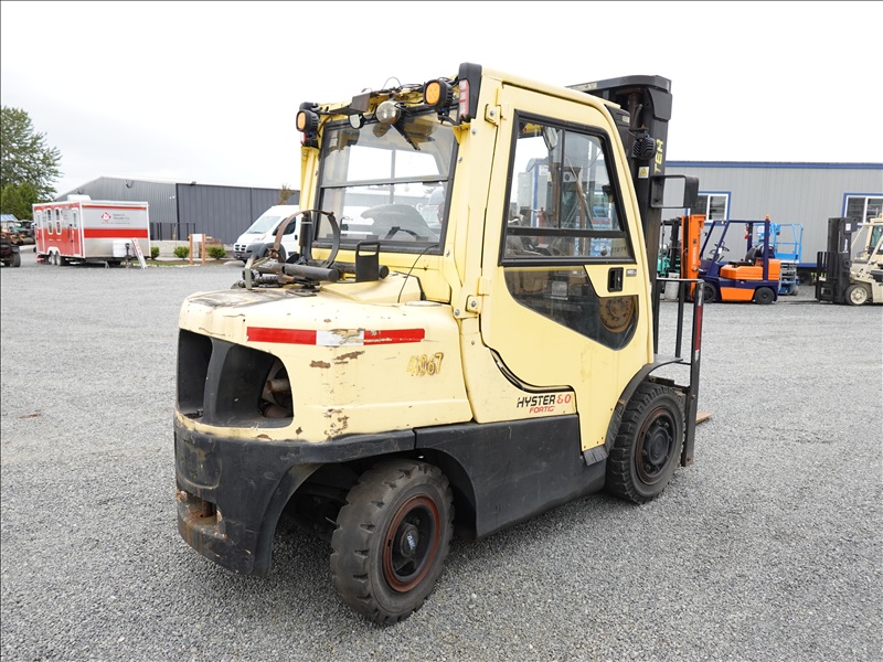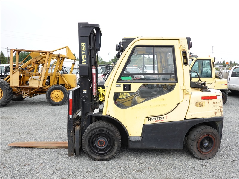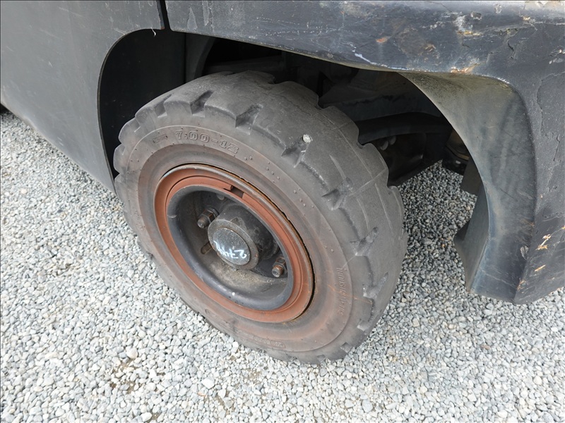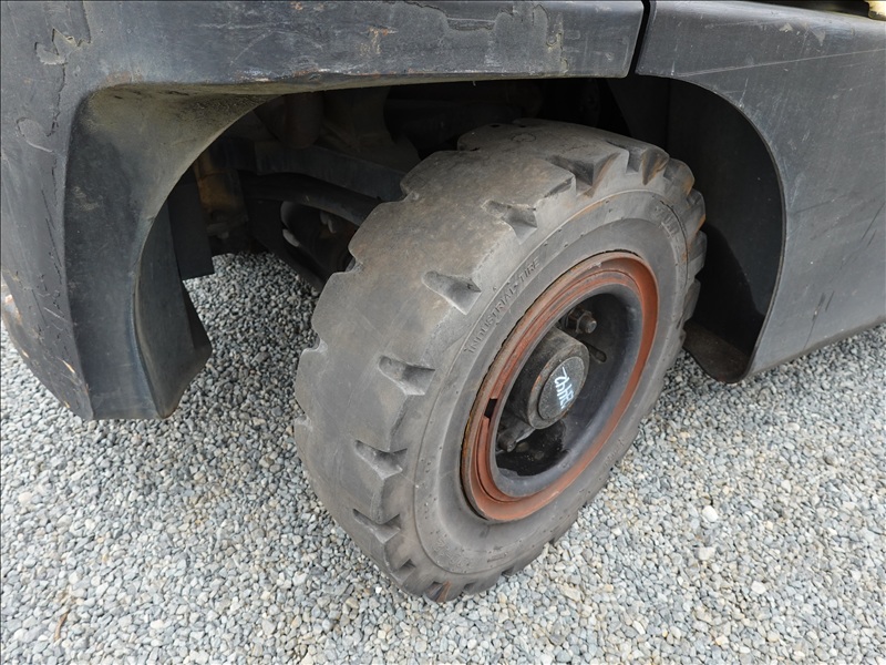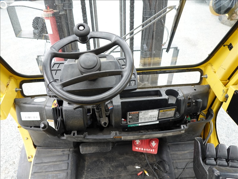 7,700 LB SOLID TIRE FORKLIFT, 143.7" FORK HEIGHT, 2-STAGE MAST, SIDE SHIFT, FORK POSITIONER, FTC, 6 CYL LPG, CAB, TOW HITCH (MISSING PART, NO KEY, NO PROPANE TANK)