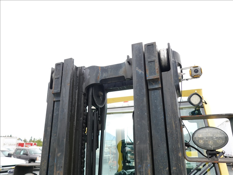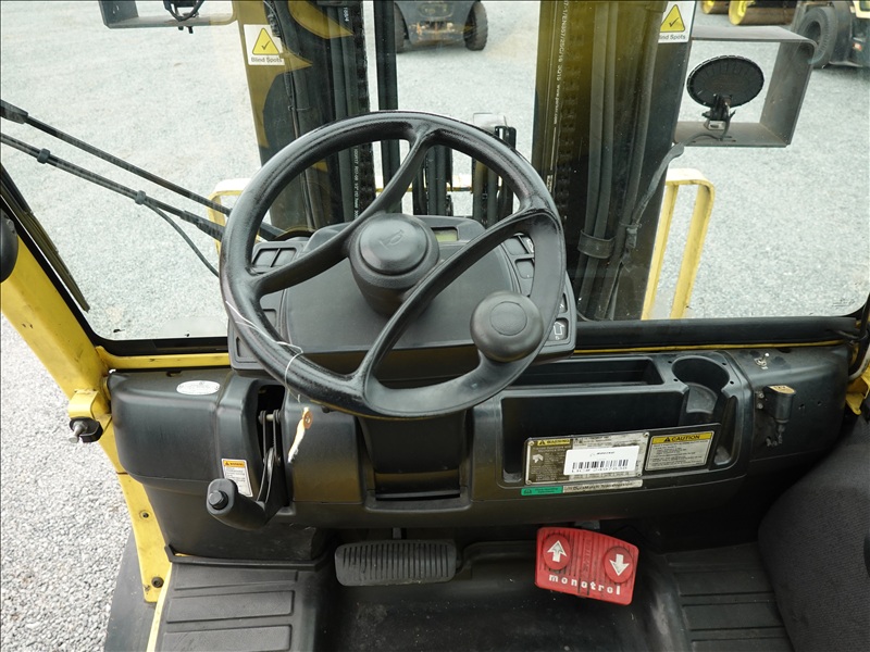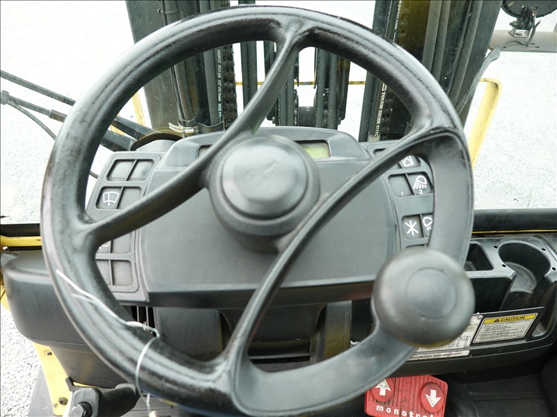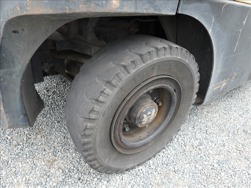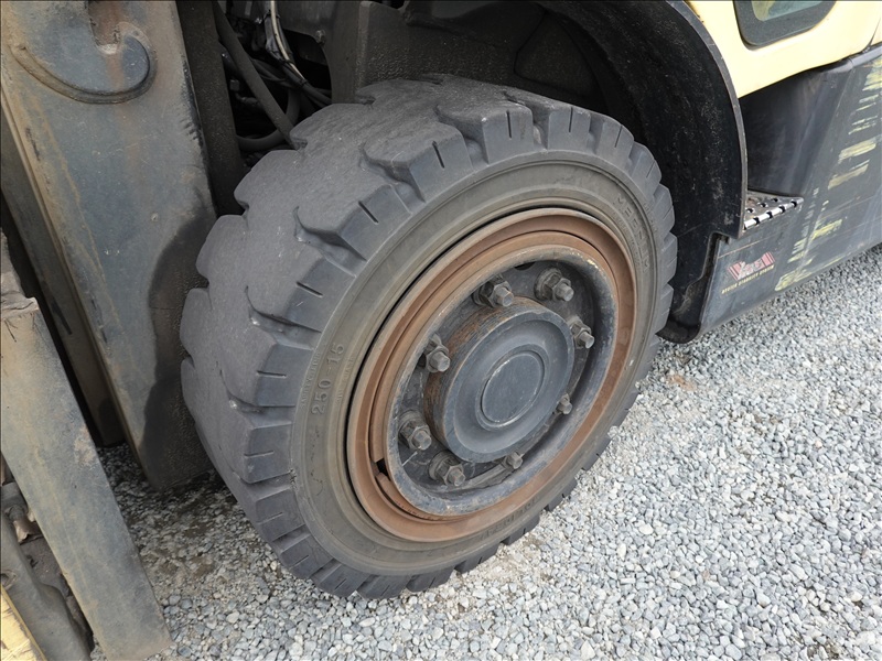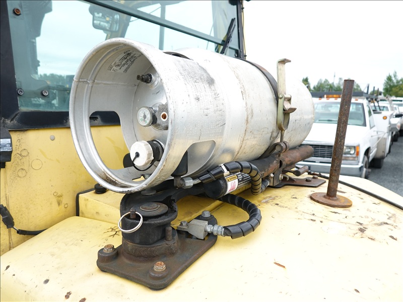 7,150 LB SOLID TIRE FORKLIFT, 185.6" FORK HEIGHT, 3-STAGE MAST, SIDE SHIFT, FORK POSITIONED, FTC, 6 CYL LPG, CAB, TOW HITCH (UNABLE TO READ HOUR METER, SEE PHOTO)