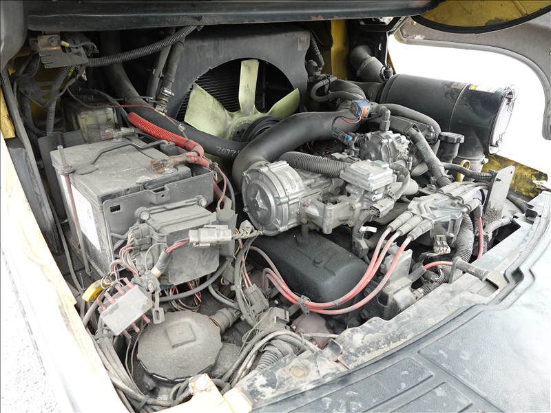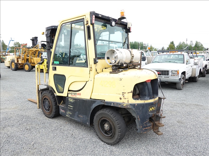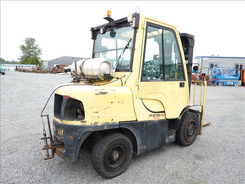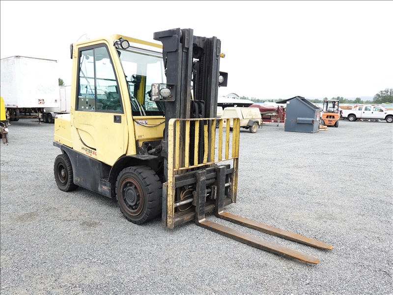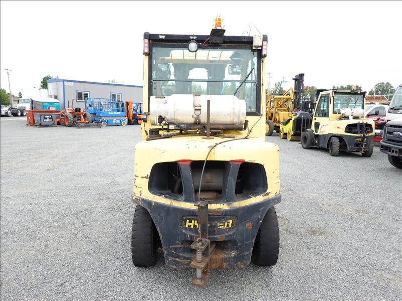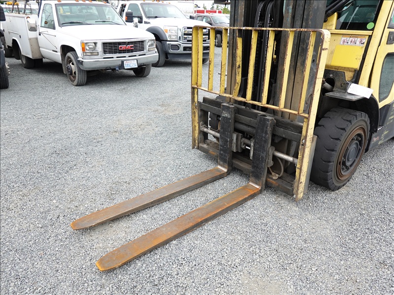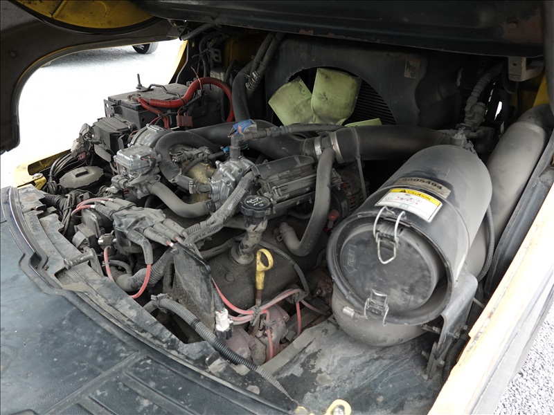 7,150 LB SOLID TIRE FORKLIFT, 185.6" FORK HEIGHT, 3-STAGE MAST, SIDE SHIFT, FORK POSITIONED, FTC, 6 CYL LPG, CAB, TOW HITCH (UNABLE TO READ HOUR METER, SEE PHOTO)