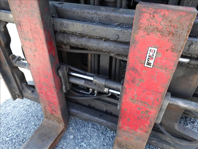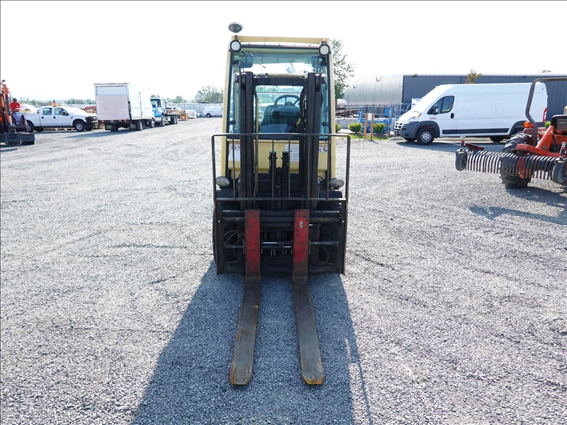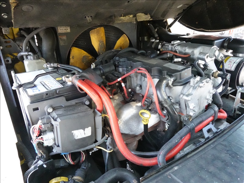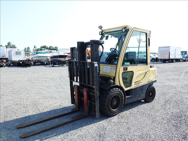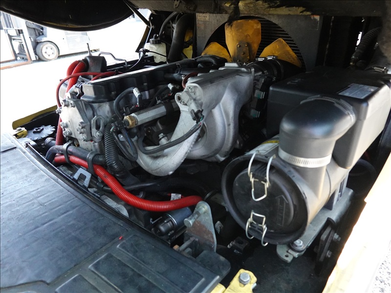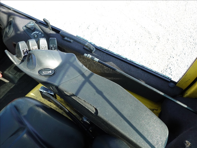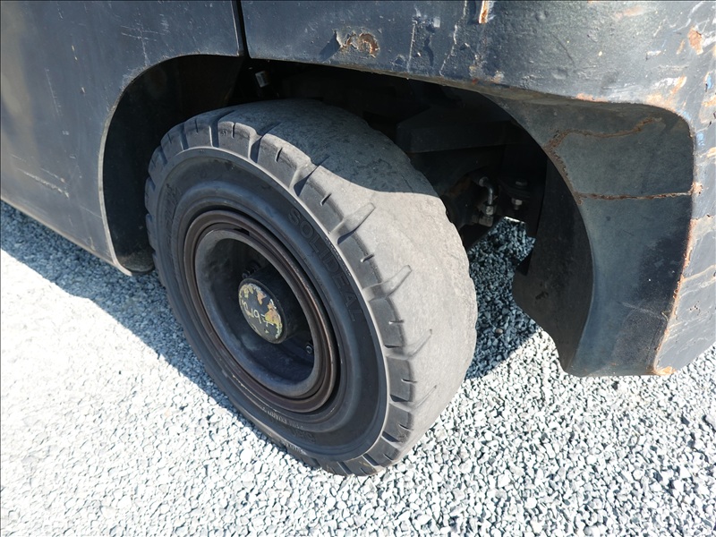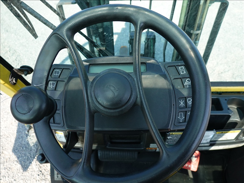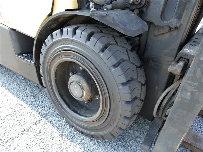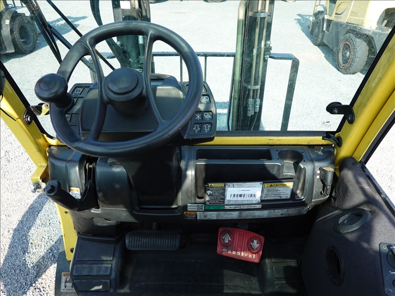 5,350 LB SOLID TIRE FORK LIFT, 2-STAGE MAST, SIDE SHIFT, FORK POSITIONER, FTC, 4 CYL LPG, CAB (NO PROPANE TANK, FUEL SYSTEM ISSUE, STARTS & DIES WHEN PRIMED)