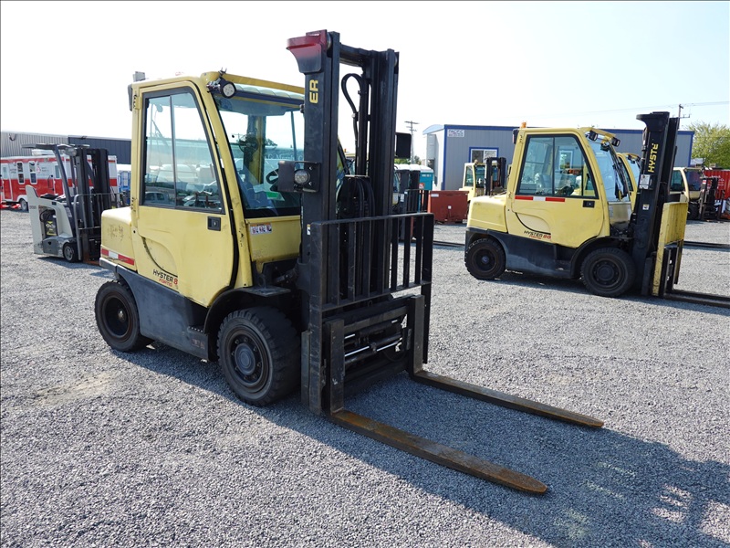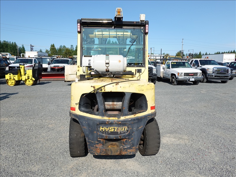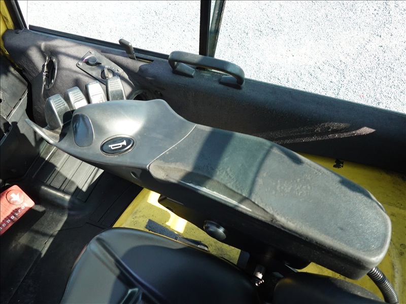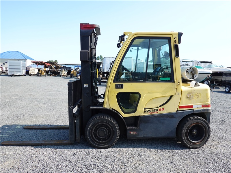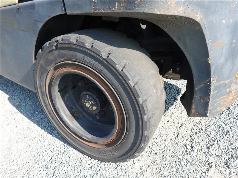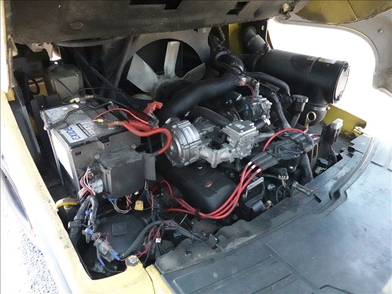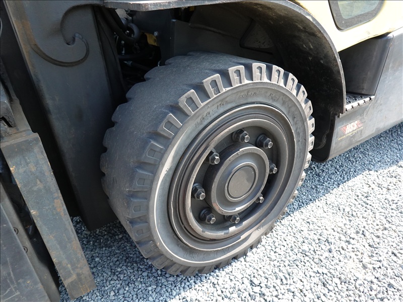 7,750 LB SOLID TIRE FORKLIFT, 144.7" FORK HEIGHT, 2-STAGE MAST, SIDE SHIFT, FORK POSITIONER, FTC, 6 CYL LPG, CAB (EXHAUST LEAK, MISSING EXHAUST COMPONENTS, UNABLE TO READ HOUR METER, SEE PHOTO)