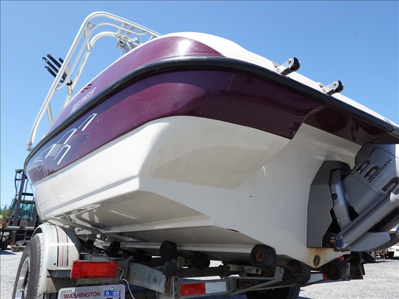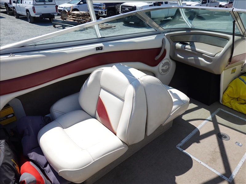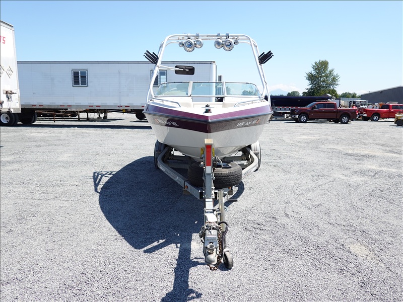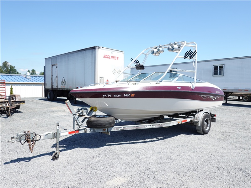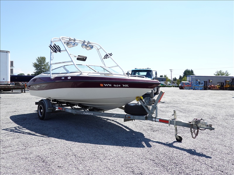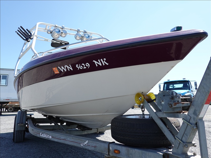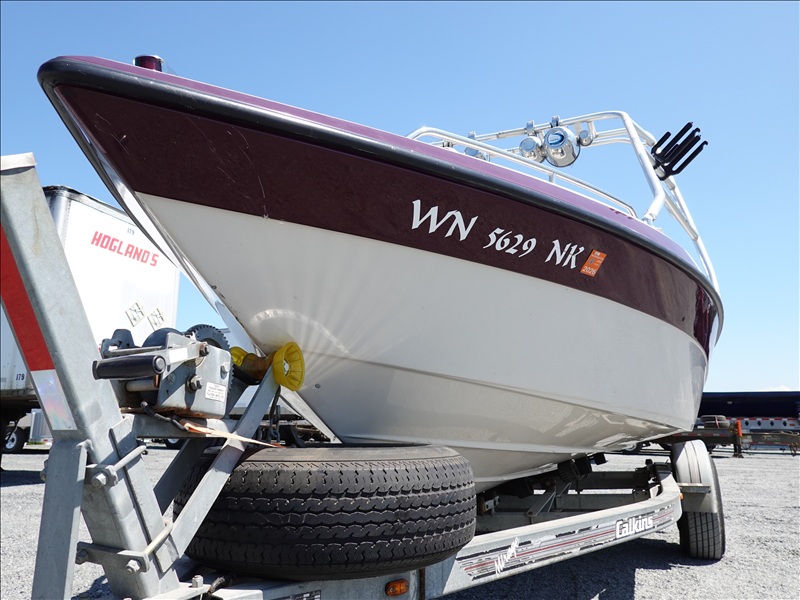 20' FIBERGLASS RUNABOUT BOAT, VOLVO PENTA SX V8 INBOARD, TOWER, BOSS SOUND SYSTEM, PYRAMID AMERICA 2,000 WATT AMPLIFIER (COME W/ASSORTED INNER TUBES, WAKEBOARDS & SKIS) W/1990 CALKINS MIRAGE, S/A, APPROX 20' GALVANIZED BOAT TRAILER, SPRING SUSPENSION, SUR
