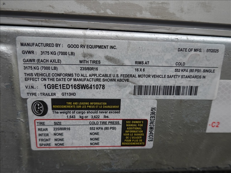 S/A, 13' X 7'2" 7,000 LV GVWR HYDRAULIC DECK ENCLOSED CARGO TRAILER, END DOOR, ELECTRIC BRAKES, 235/80R16
