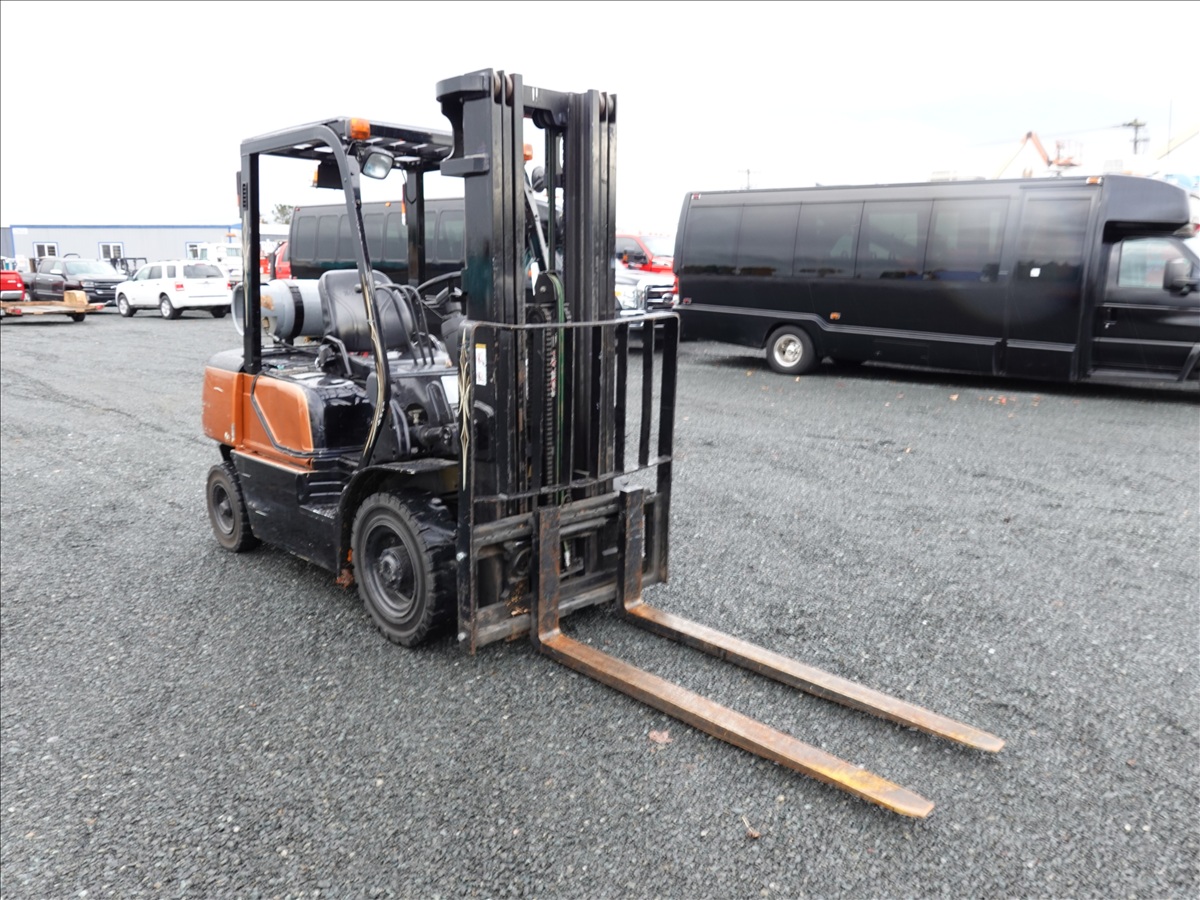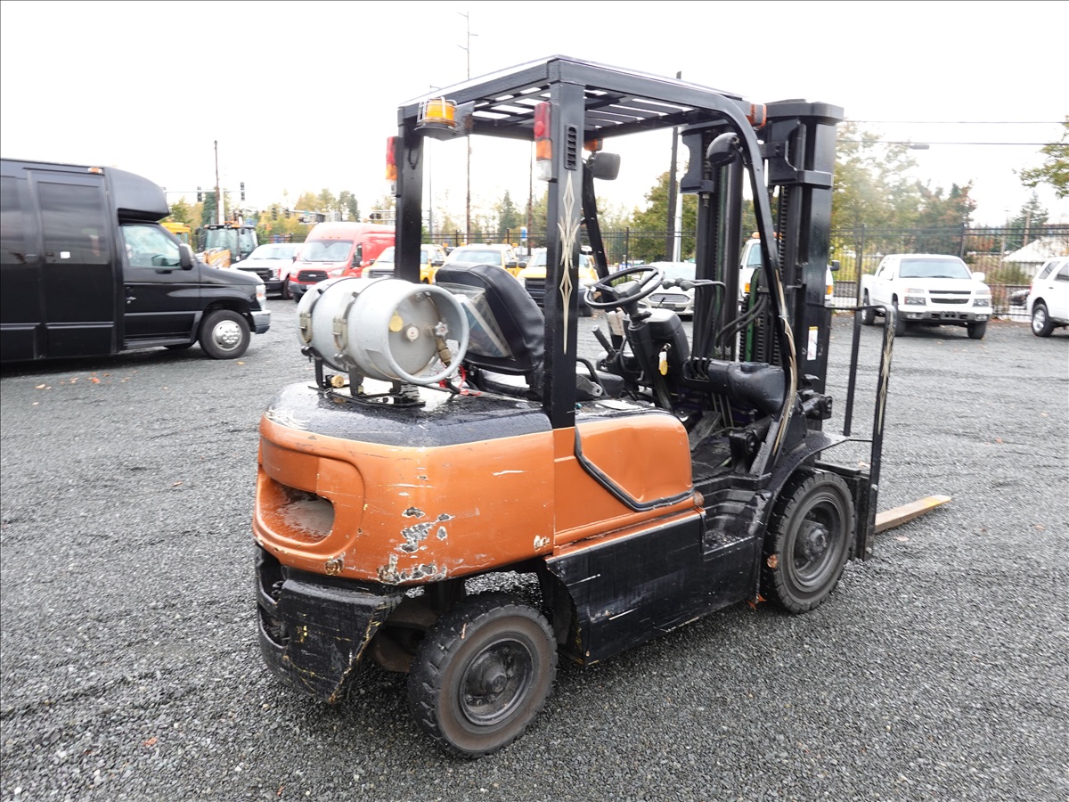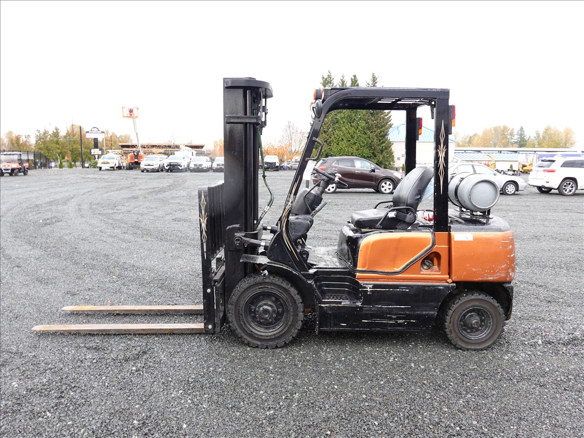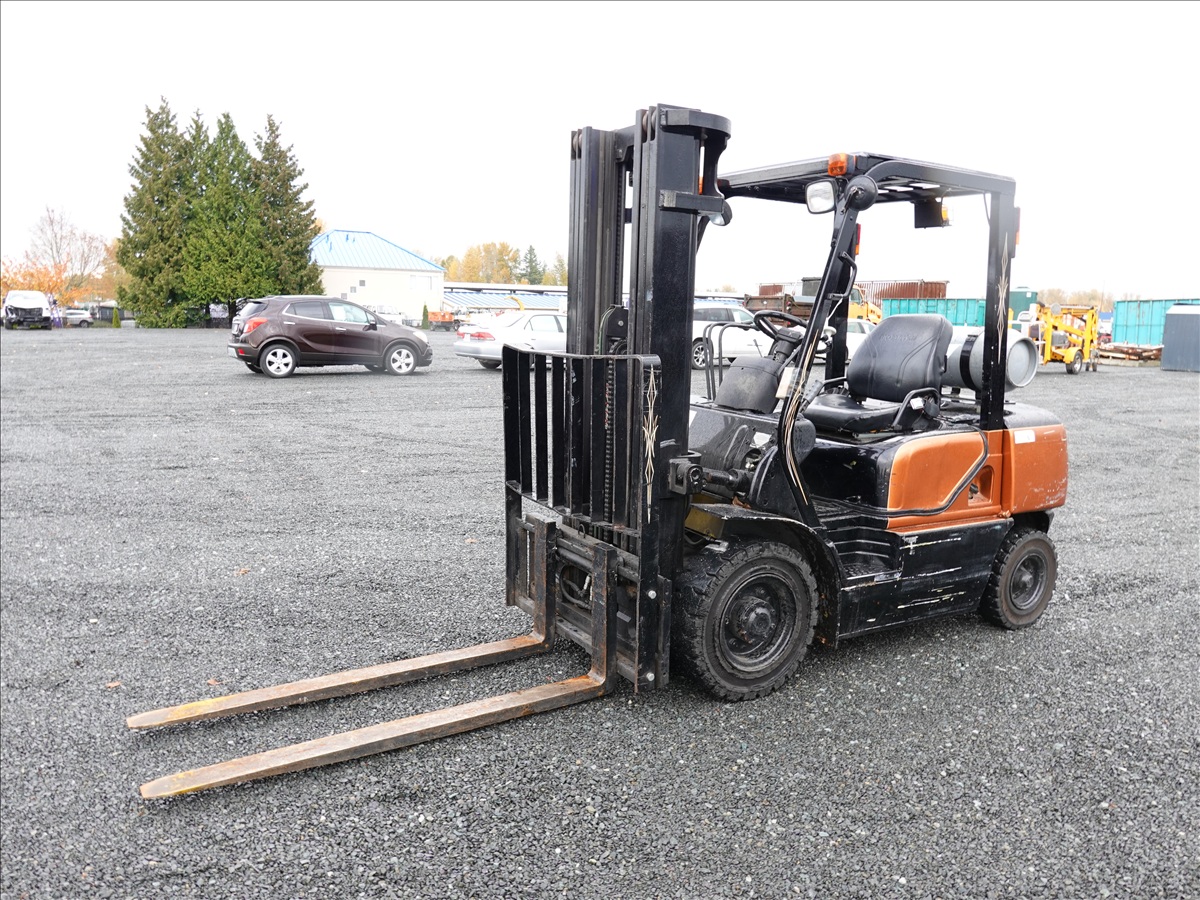 4,400 LB SOLID TIRE FORKLIFT, 188" FORK HEIGHT, 3-SATGE MAST, SIDE SHIFT, 96" FORK EXTENSIONS, 4 CYL LPG