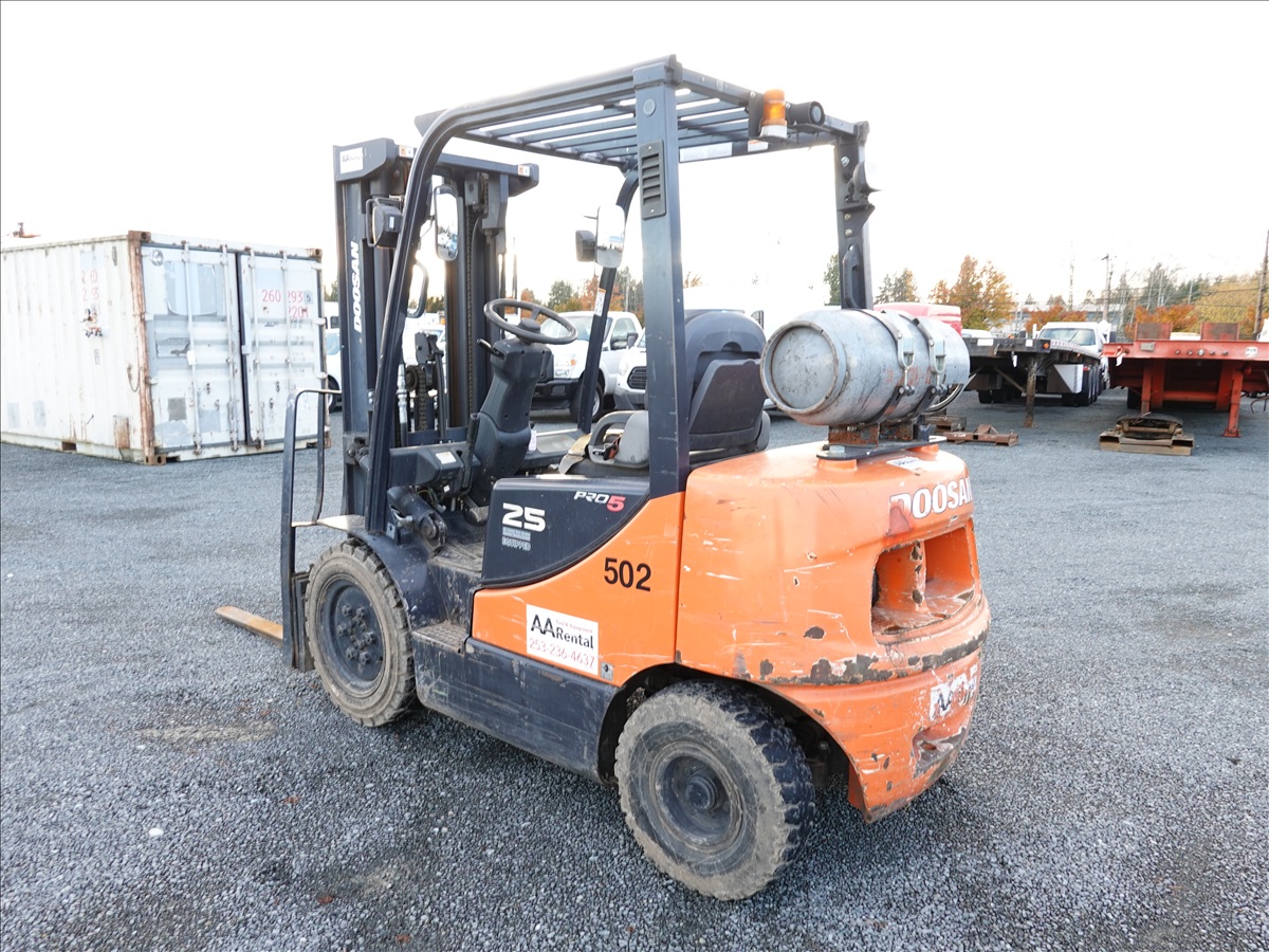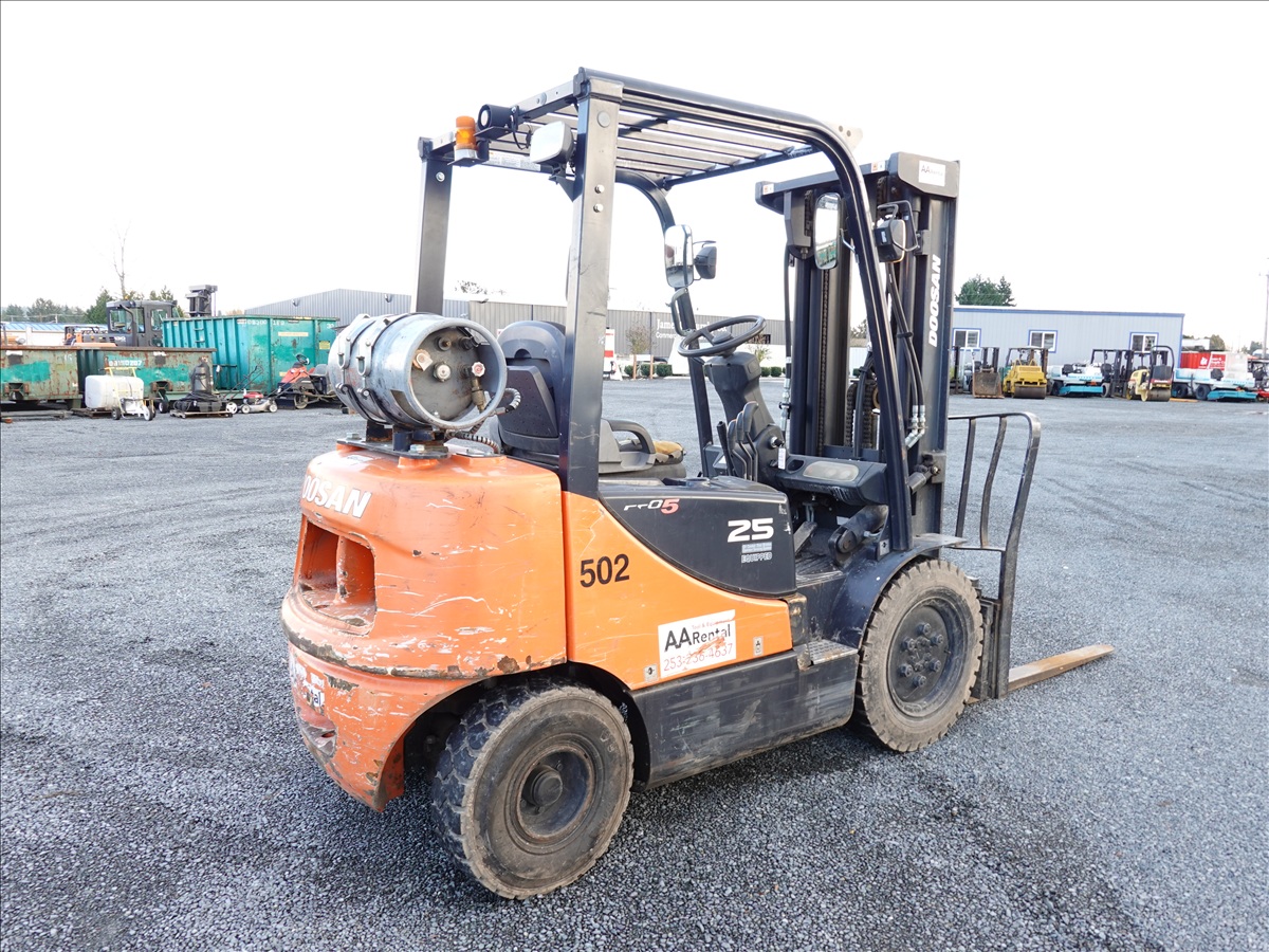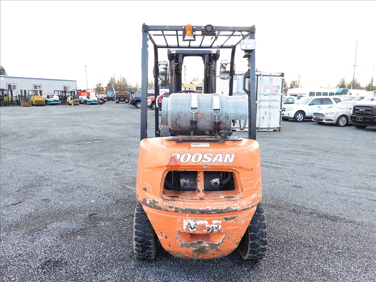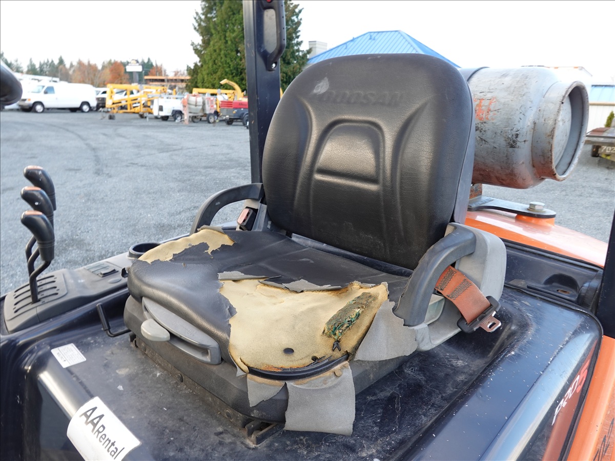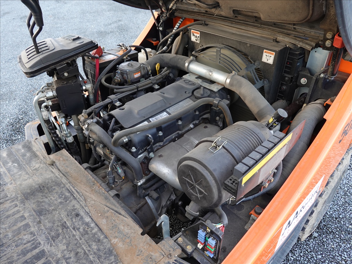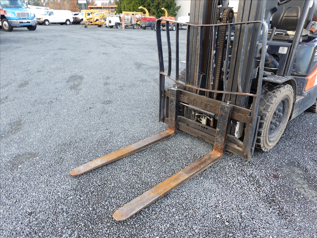 4,200 LB SOLID TIRE FORKLIFT, 189" FORK HEIGHT, 3-STAGE MAST, SIDE SHIFT, 47" FORKS, 4 CYL LPG
