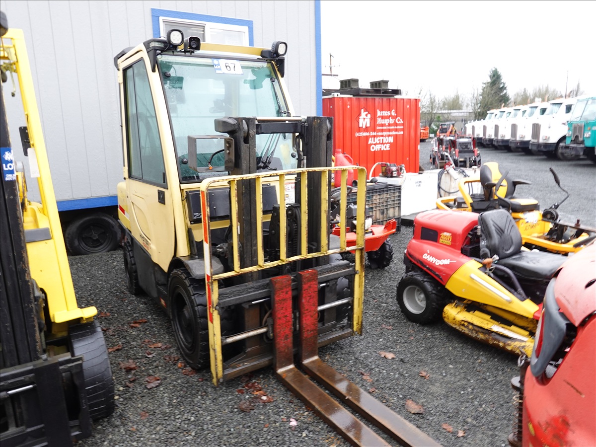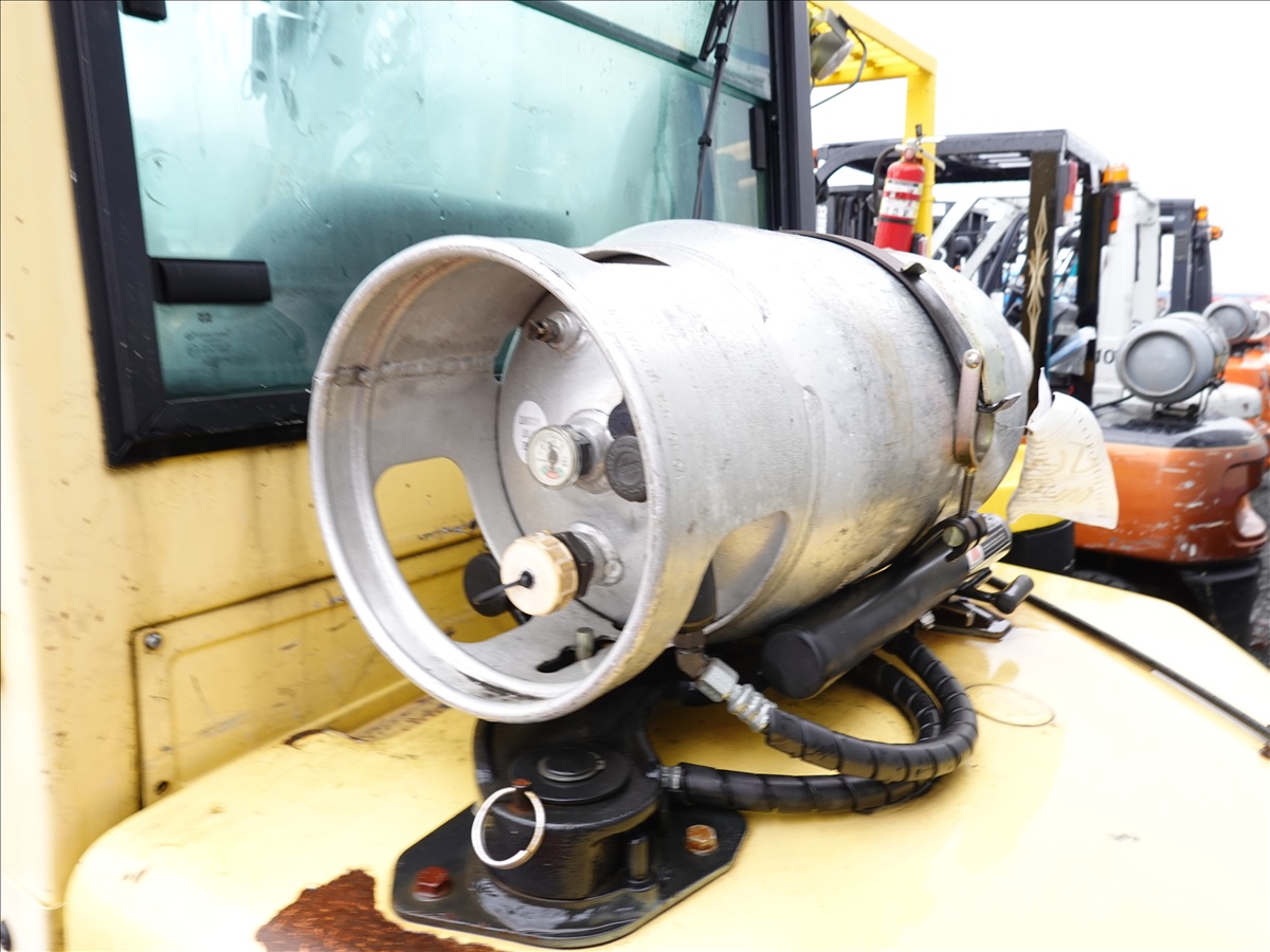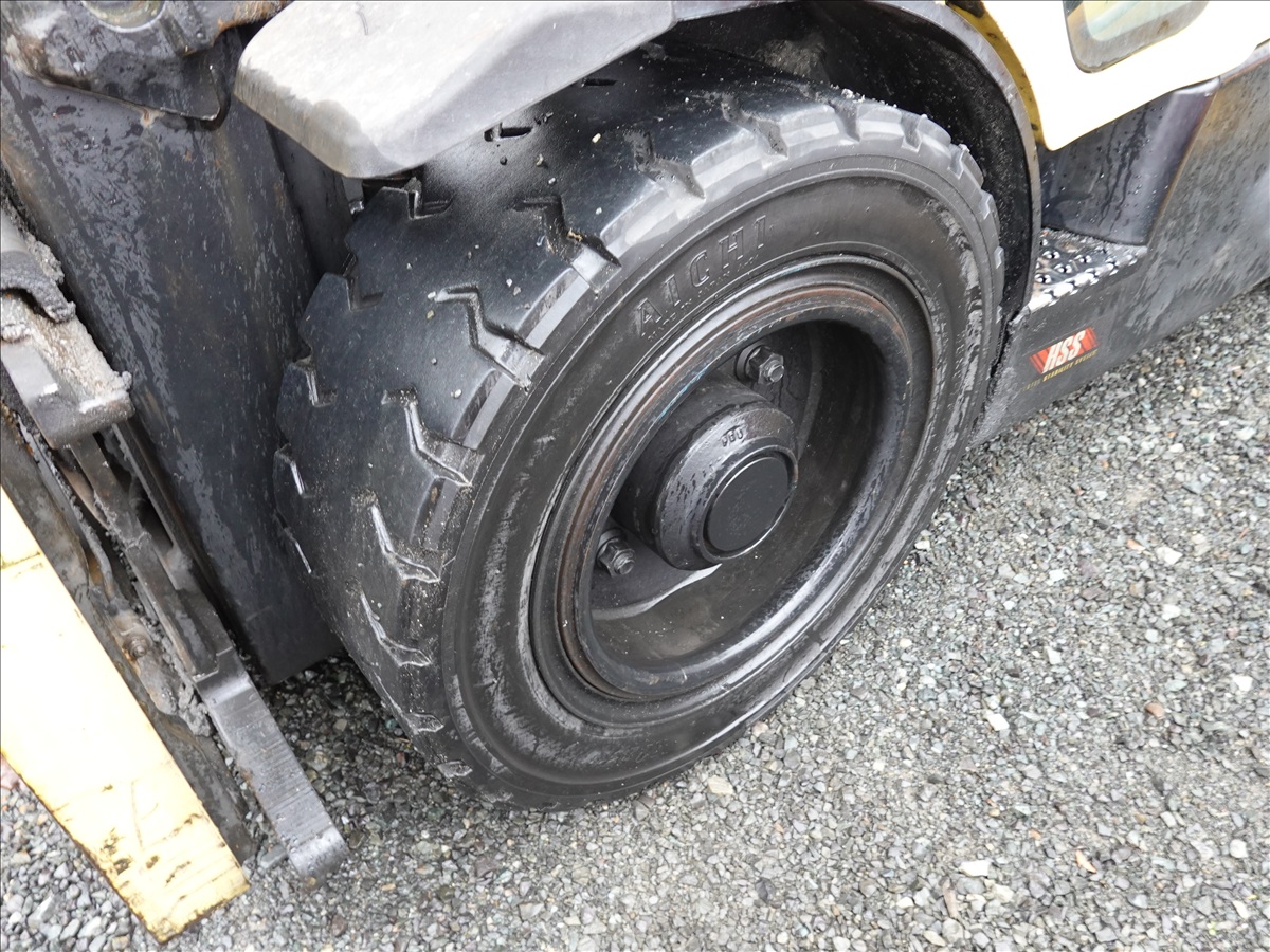6,500 LB SOLID TIRE FORKLIFT, 79" FORK HEIGHT, 2 STAGE MAST, SIDE SHIFT, FORK POSITIONERS, 54" FORKS, 4 CYL LPG, CAB (UNABLE TO READ HOUR METER )