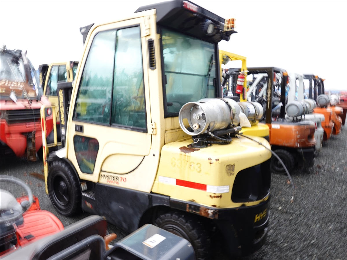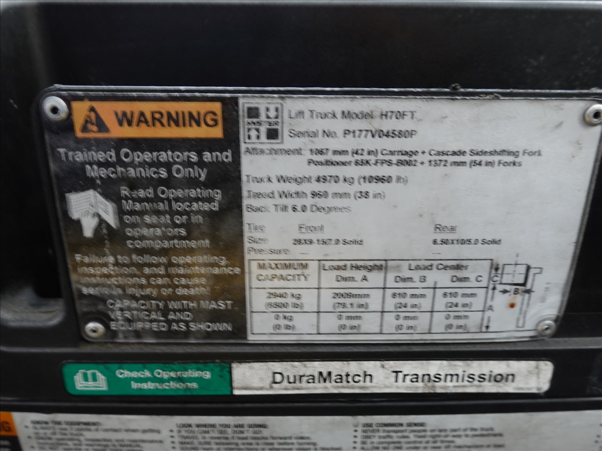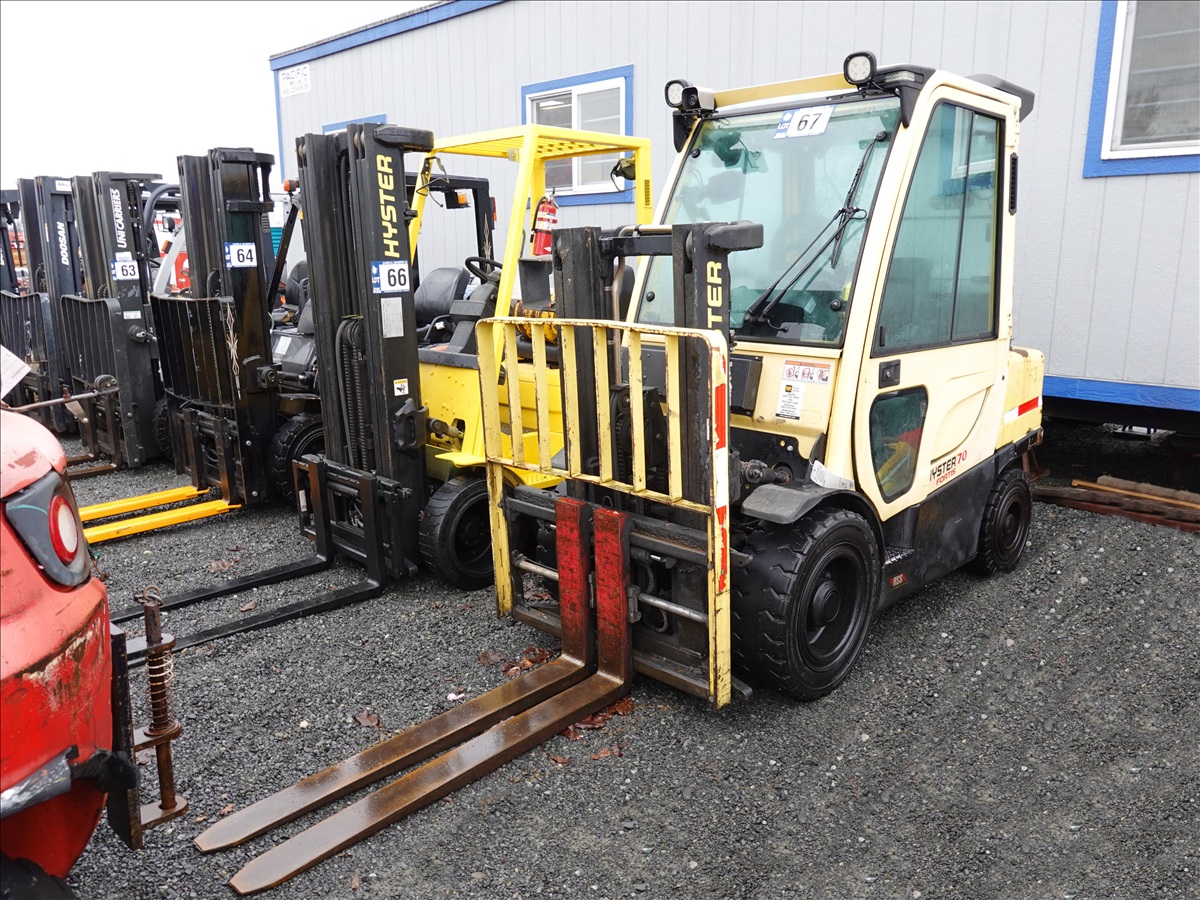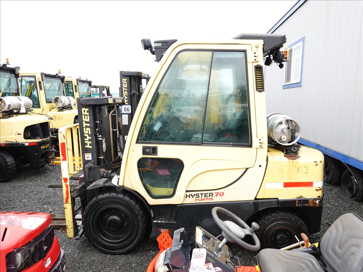6,500 LB SOLID TIRE FORKLIFT, 79" FORK HEIGHT, 2 STAGE MAST, SIDE SHIFT, FORK POSITIONERS, 54" FORKS, 4 CYL LPG, CAB (UNABLE TO READ HOUR METER )