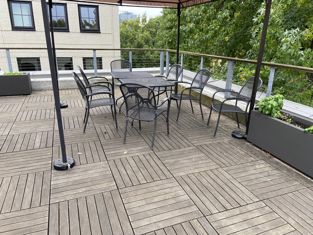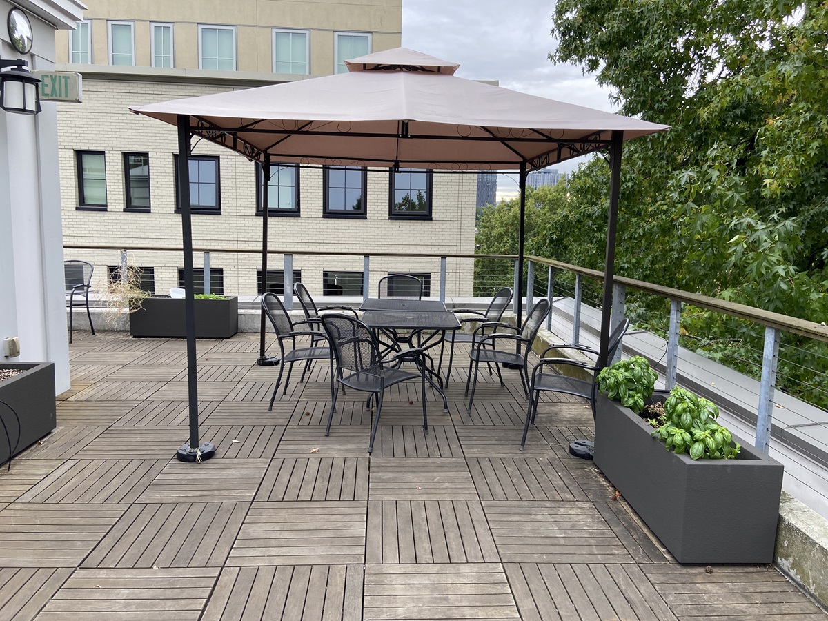 METAL MESH OUTDOOR FURNITURE TO INCLUDE: (7) 31"X31" TABLES, (27) CHAIRS, (2) 4' BENCHES, (4) SIDE TABLES, & (2) 9'X9' METAL FRAME CANOPIES
