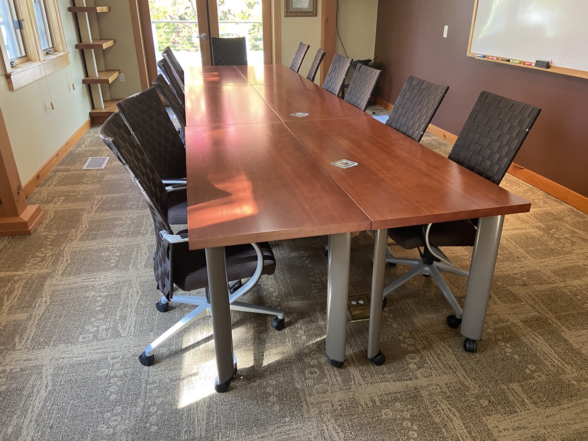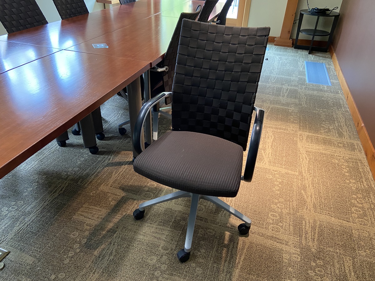 VARIABLE ARRANGEMENT MOBILE CONFERENCE TABLE SETUP CONSISTING OF: (6) 2'X5' WOOD TOP TABLES ON CASTORS & (14) WOVEN FABRIC HIGH BACK ARM CHAIRS ON CASTORS