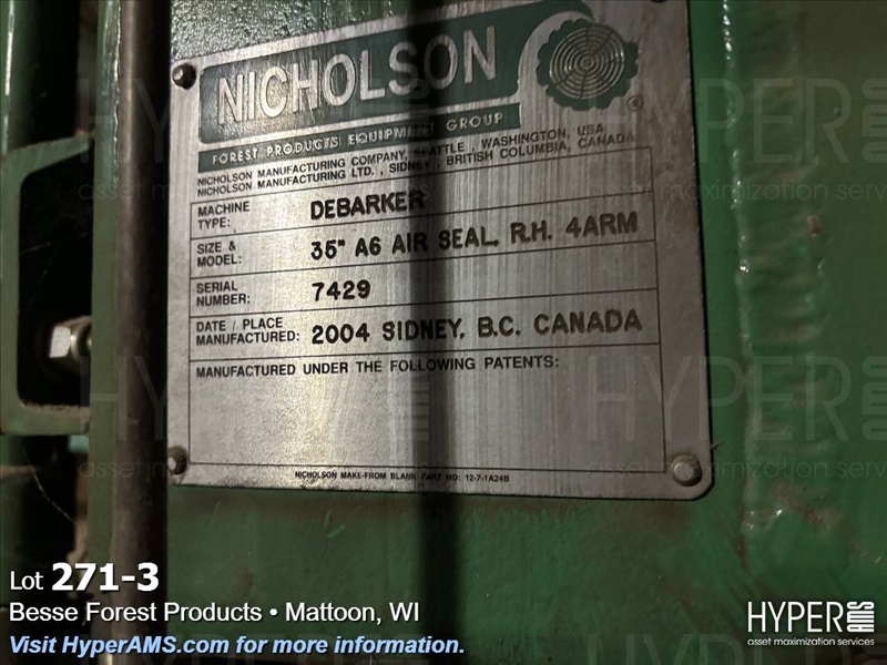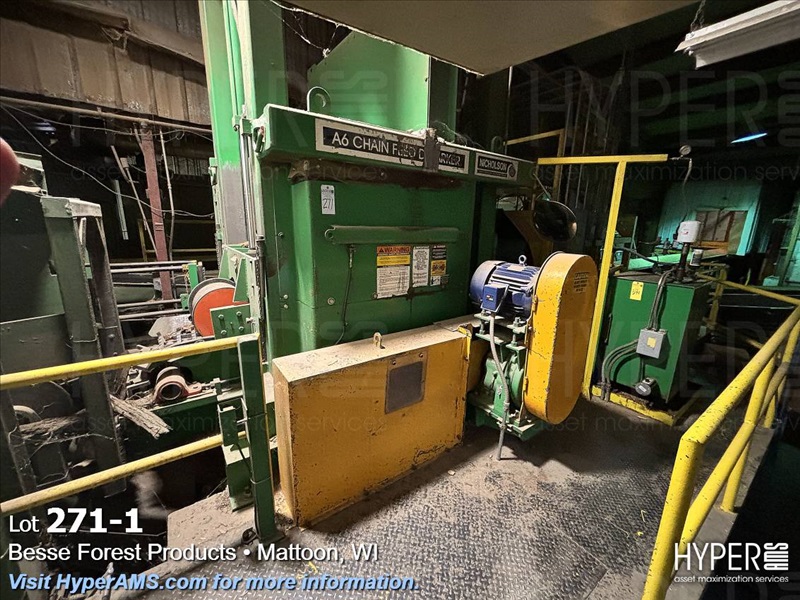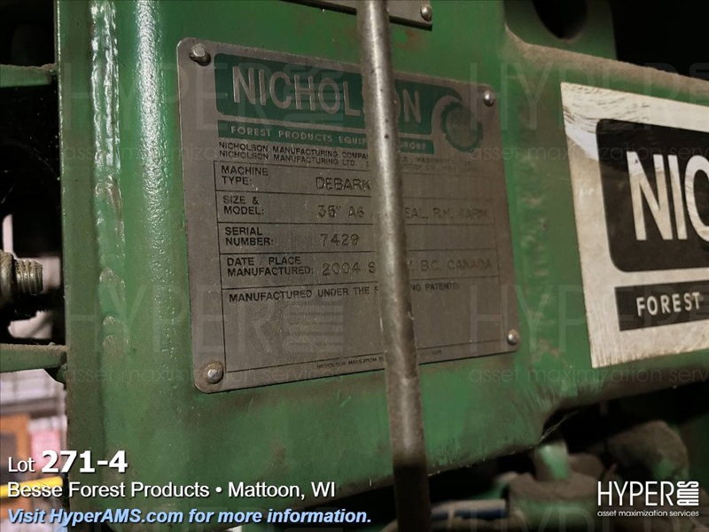 NICHOLSON A 6 CHAIN FEED DEBARKER WITH RING LUBE TANK, HYDRAULIC UNIT, AIR RESERVIOR, 32" MAX, MFG. #A44600B