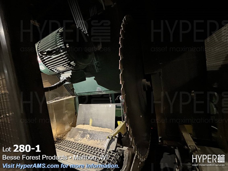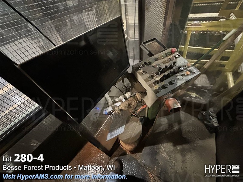 LARGE CHOP SAW WITH INFEED AND OUT FEED CONVEYOR, (2) HYDRAULIC UNITS, OUT FEED WITH KICK OFF AND CONTROL BOOTH