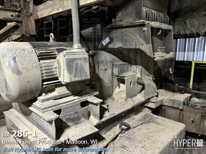 MONGOMERY BLOCK END HOG , 150 HP, HAMMER HOG, 21"X34" INLET OPENING, WITH H CHAIN OUTLET CONVEYOR APPX. 12"X13'