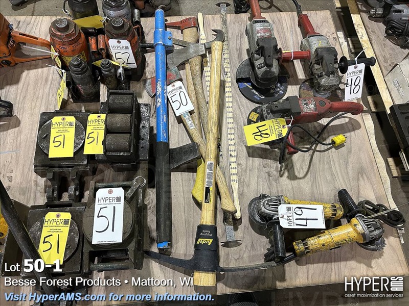 DIGGING TOOL, (2) AXES, (2) SCALE STICKS, CANT HOOK
