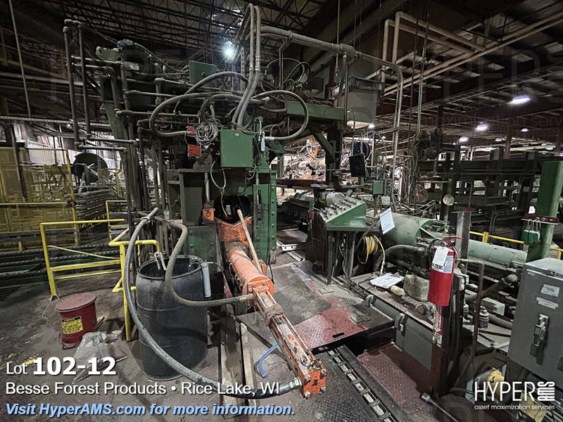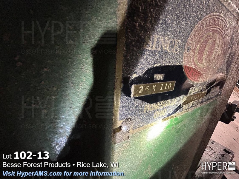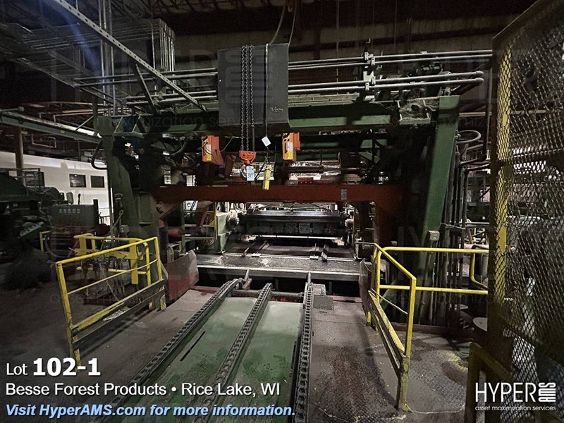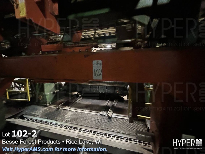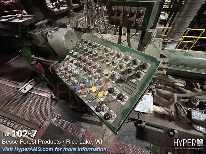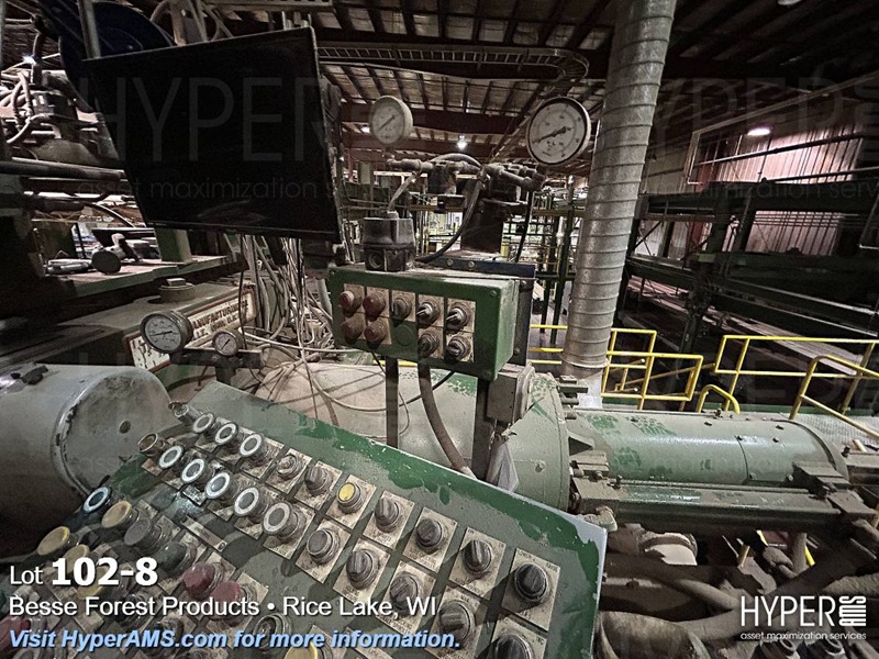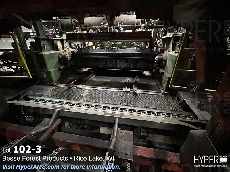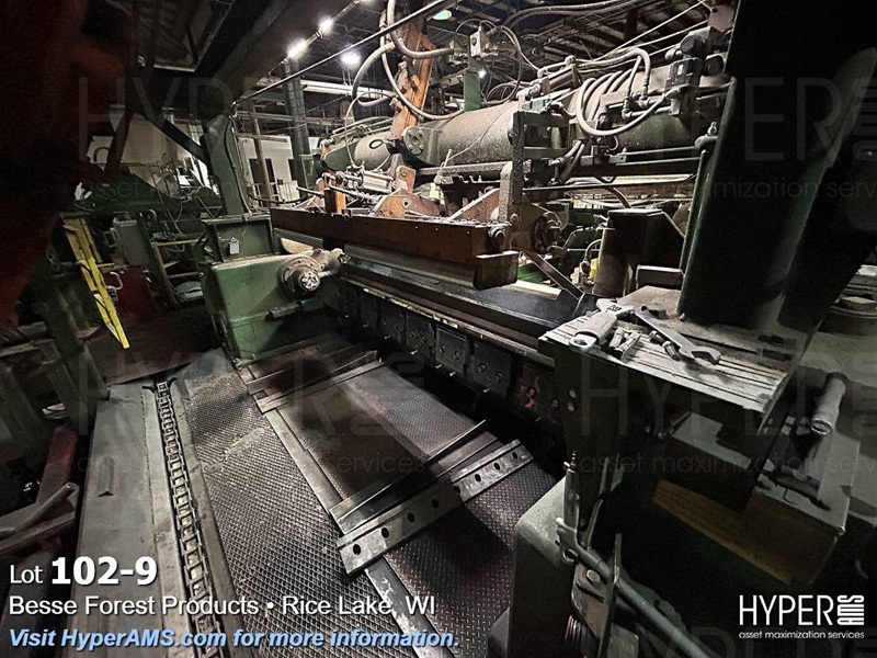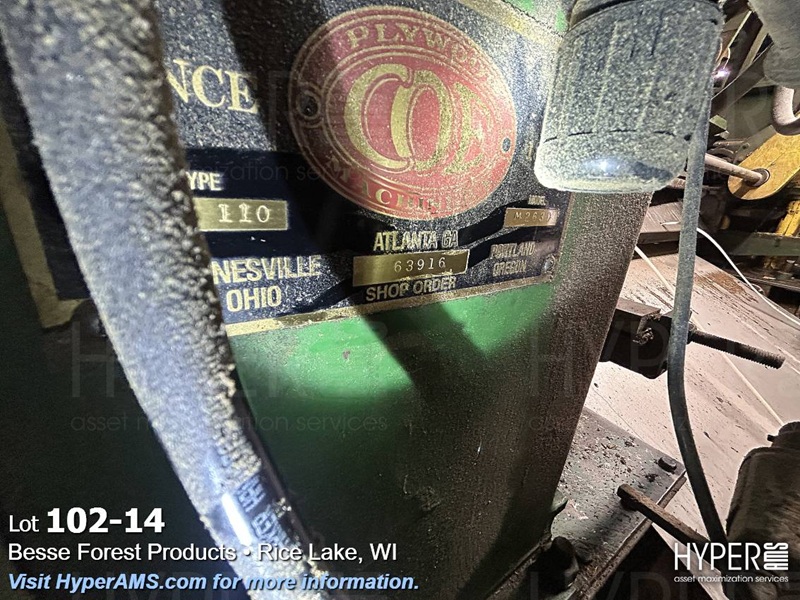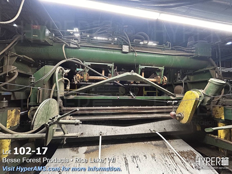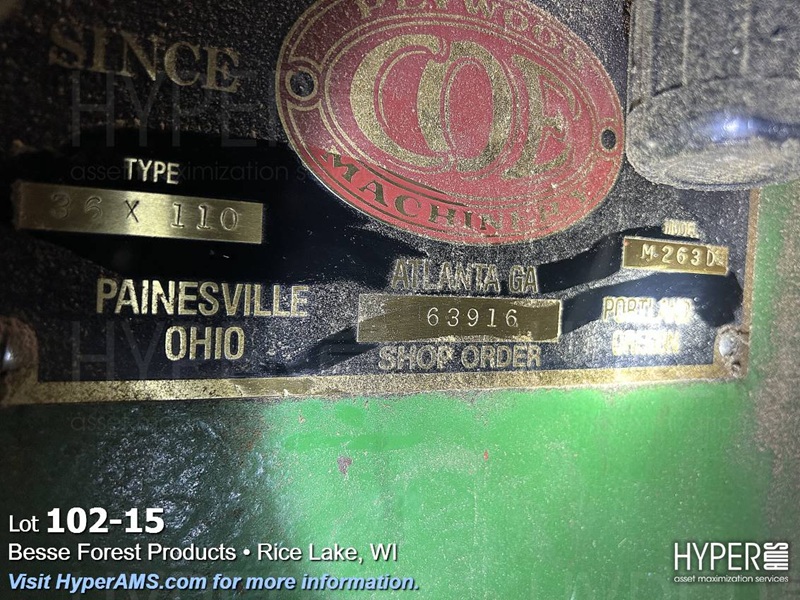 COE 110" VENEER LATHE MODEL 263, DUAL SPINDLE 4" AND 7", DIRECT PRESSURE BACK UP ROLL, XY CHARGER, SPINDLE DRIVE MOTOR REBUILT IN 2019 WITH UPGRADED SPINDLE CONTROL (SUBJECT TO THE BULK BID ON LOT 100)