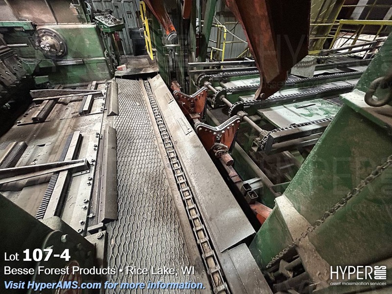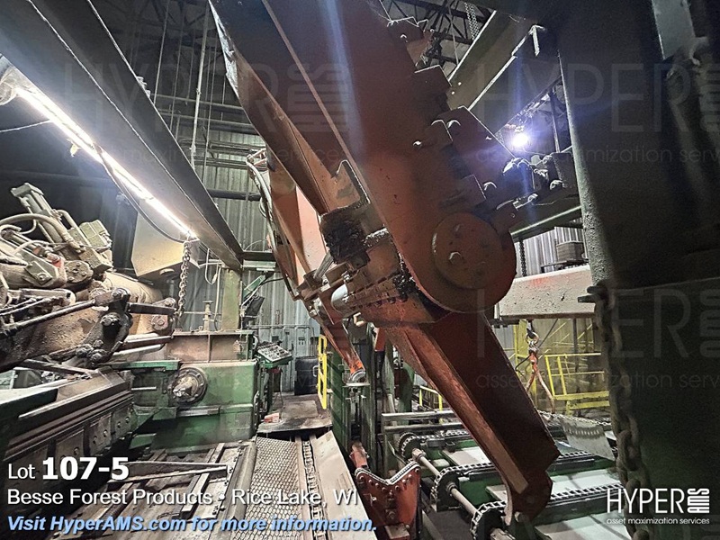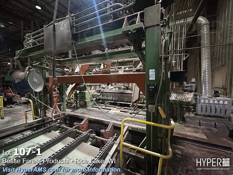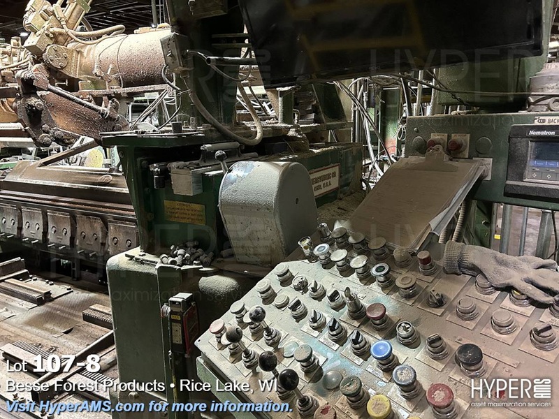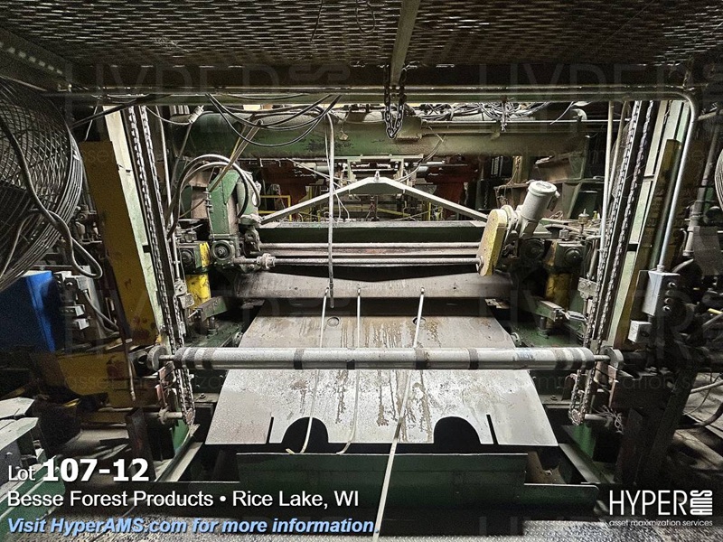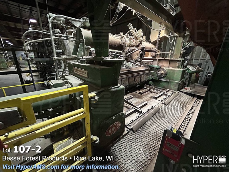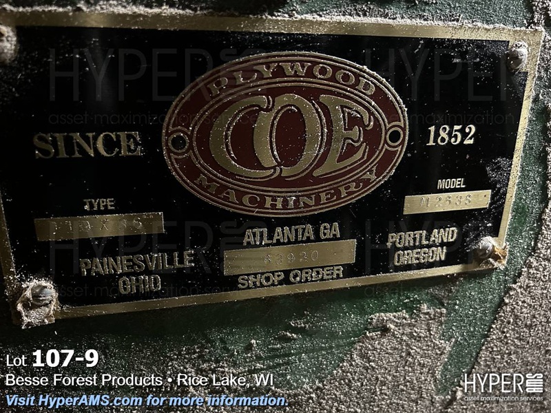 COE 110" VENEER LATHE MODEL 263, 5" SPINDLES WITH STEADY RESTS, C4S BACKUP ROLL, GEO CHARGER, SPINDLE DRIVE MOTOR REBUILT 2019, CONTROL UPDATED 2019, 2016 MERRITT CARRIAGE DRIVE UPDATE (SUBJECT TO THE BULK BID ON LOT 100)
