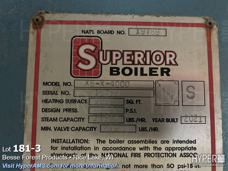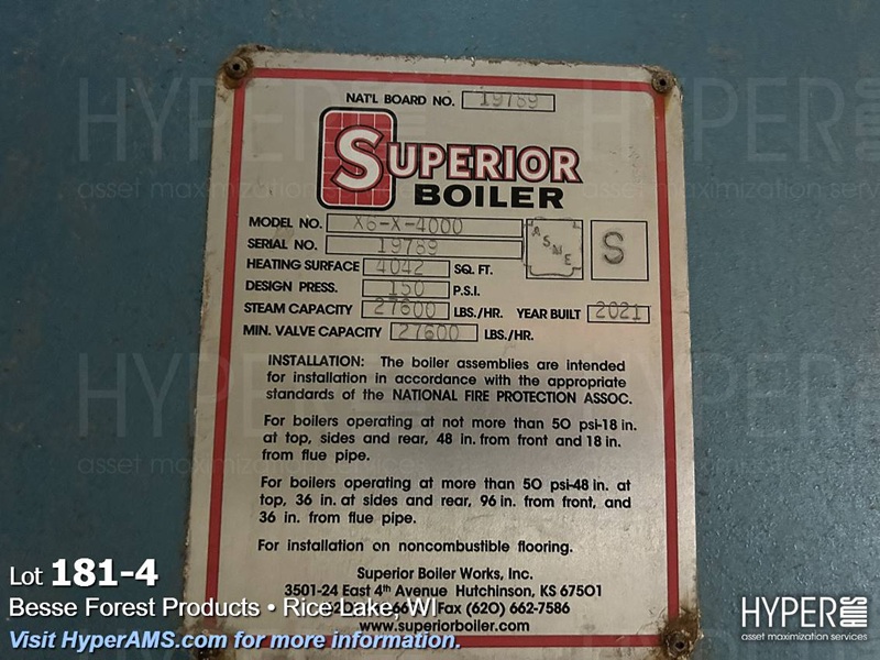SUPERIOR BOILER, NATURAL GAS, MODEL X6-X-4000, S/N#19789, 27,600 STEAM #HR, YEAR 2021, 150 PSI, WITH MAKE UP WATER PUMPS