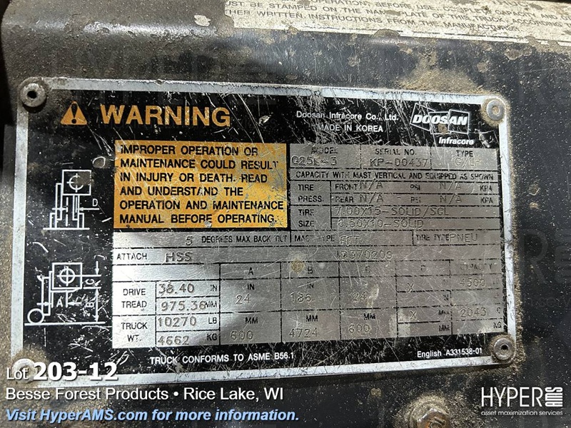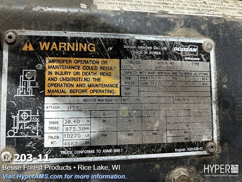 DOOSAN G15E-3 4500LB CAP. FORKLIFT, SIDE SHIFT, 47" FORK, 29411, S/N KP-00437