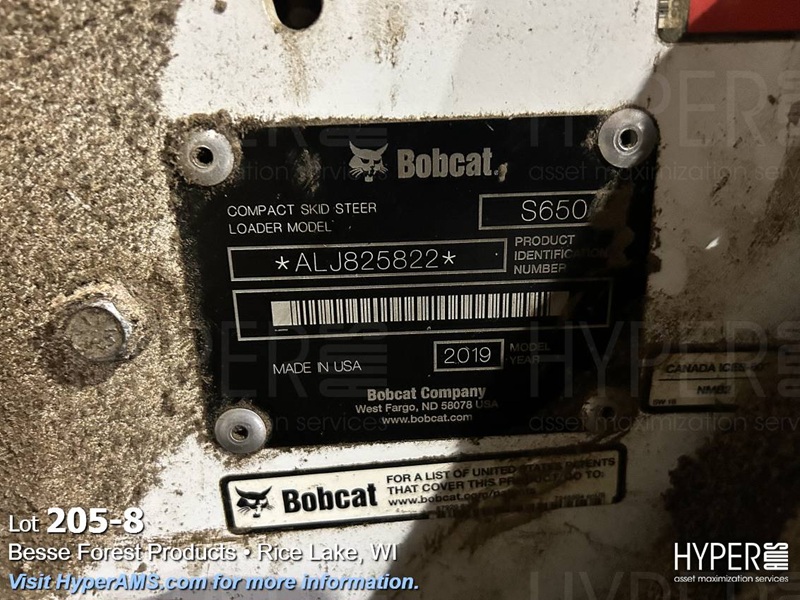 BOBCAT S650 SKID STEER LOADER, 2019 YEAR, 5983.3 HR, S/N *ALJ825822*