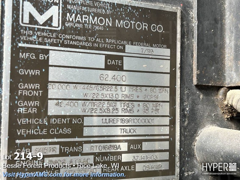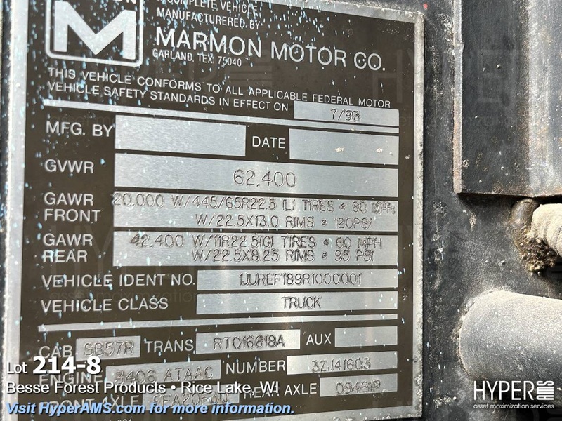 MARMON LOG TRUCK, 86 ELITE GRAPEL, VIN: 1JUREF189R1000001 NOT RUNNING