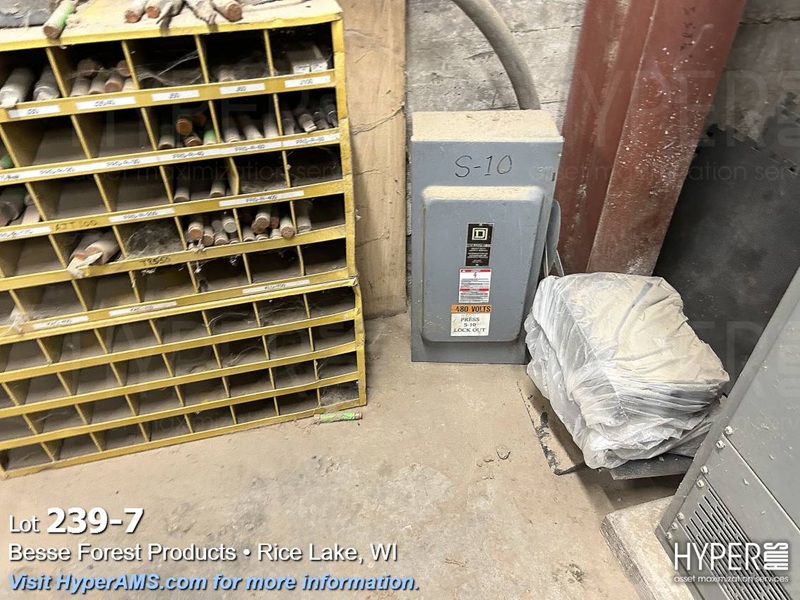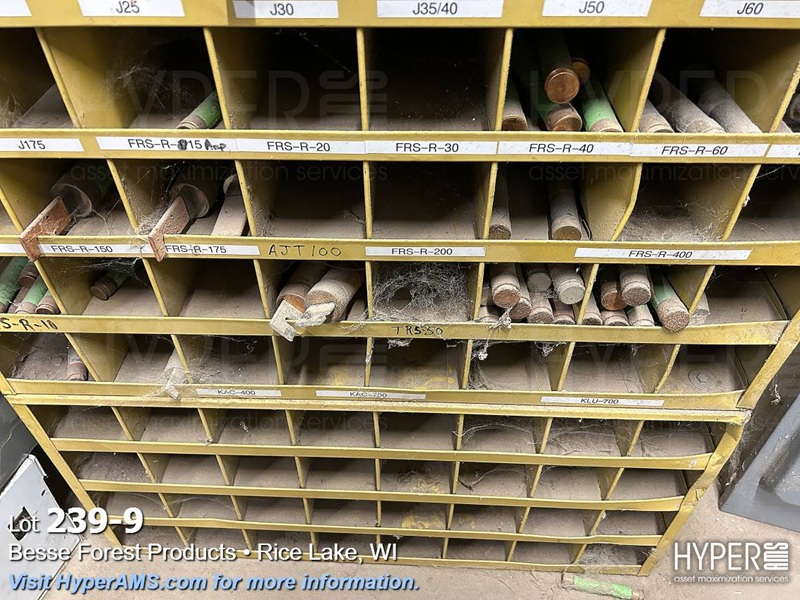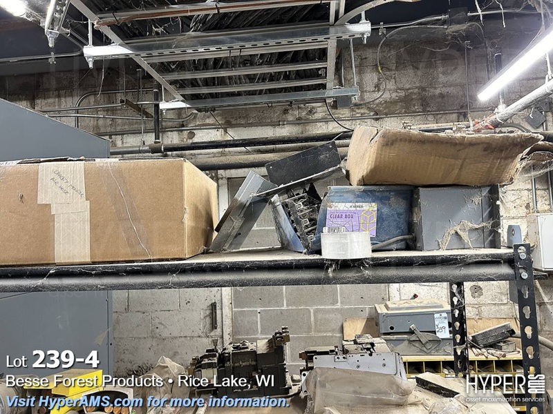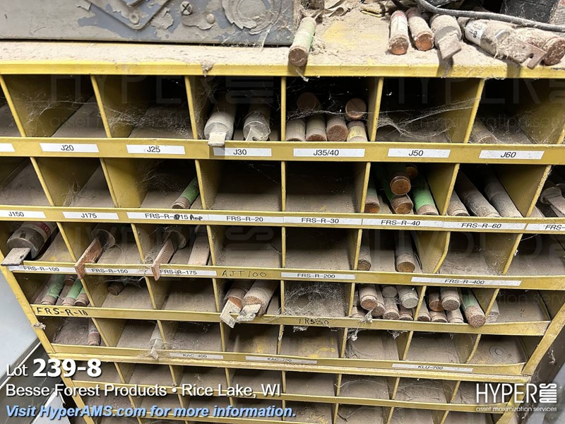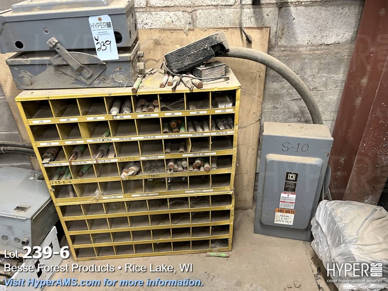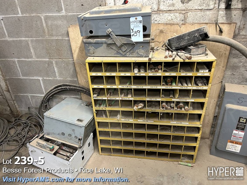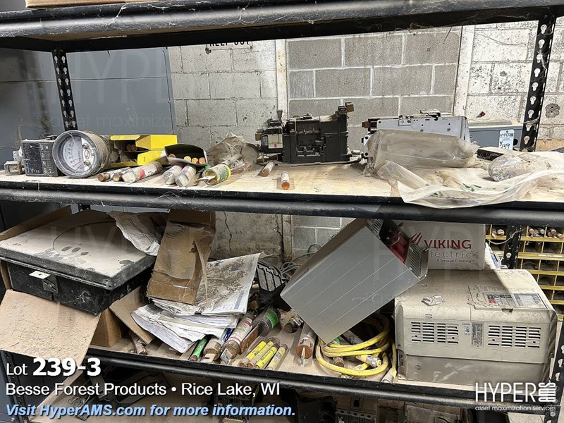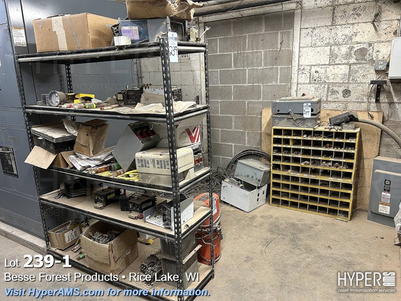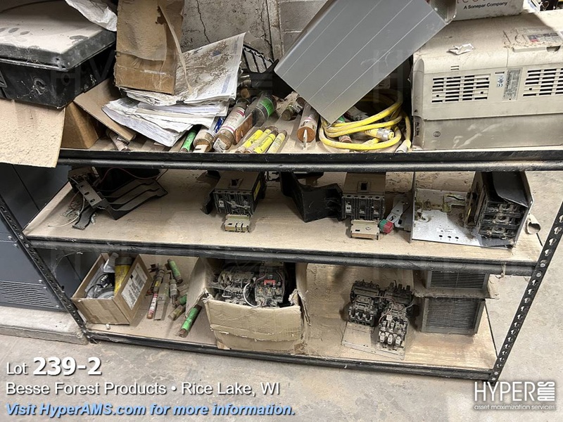 SHELF UNIT WITH BREAKERS, FUSES, VFD'S AND ELECTRICAL BOXES AND RACK OF FUSES