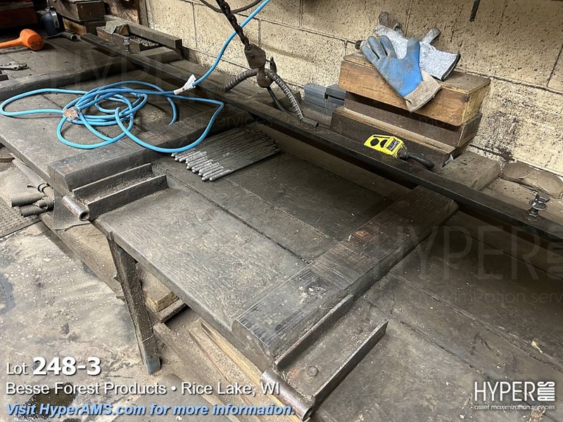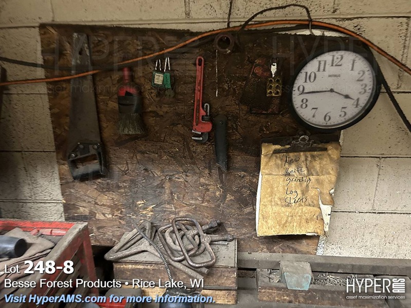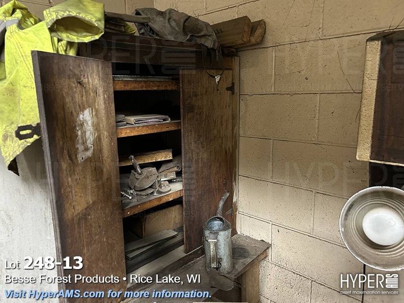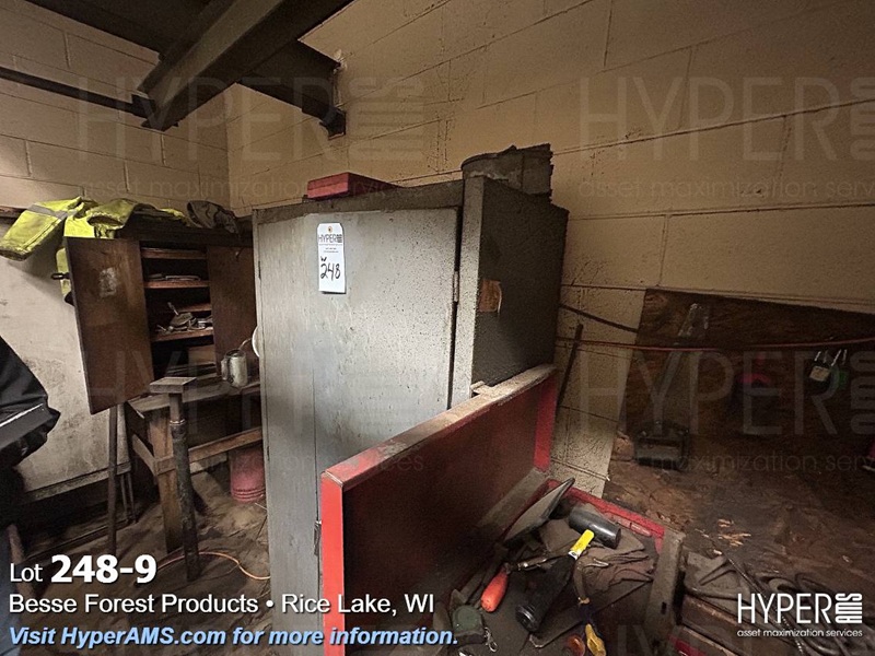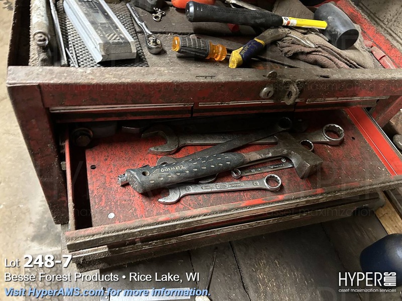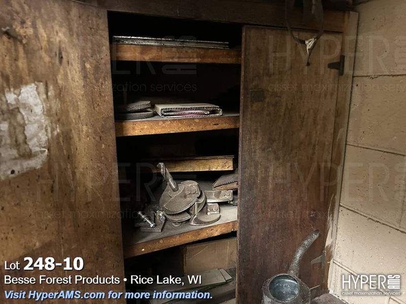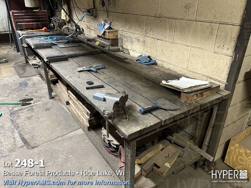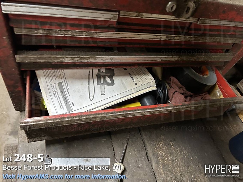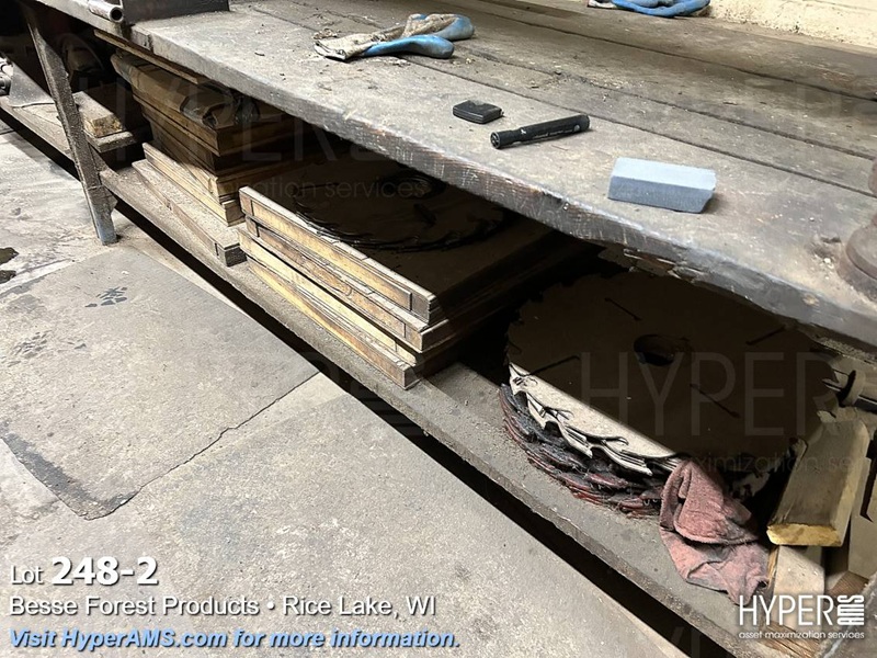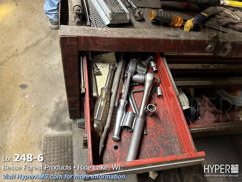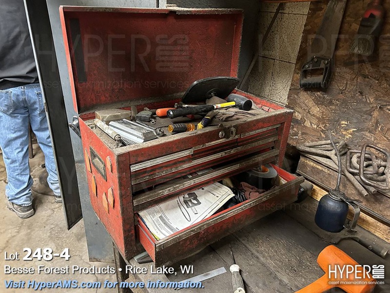 WOOD BENCH WITH SAW BLADES, 6 DRAWER TOOL BOX WITH TOOLS, 2 DOOR CABINET WITH CONTENTS, WOOD CABINET IN CORNER