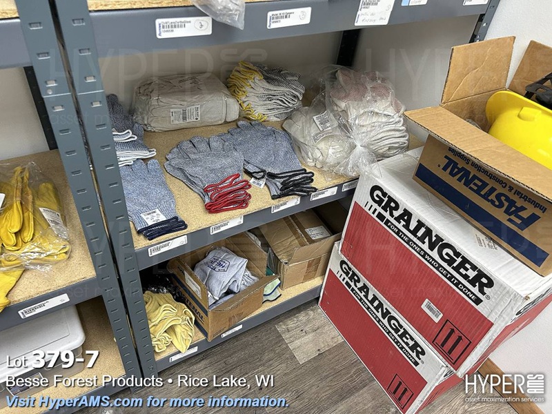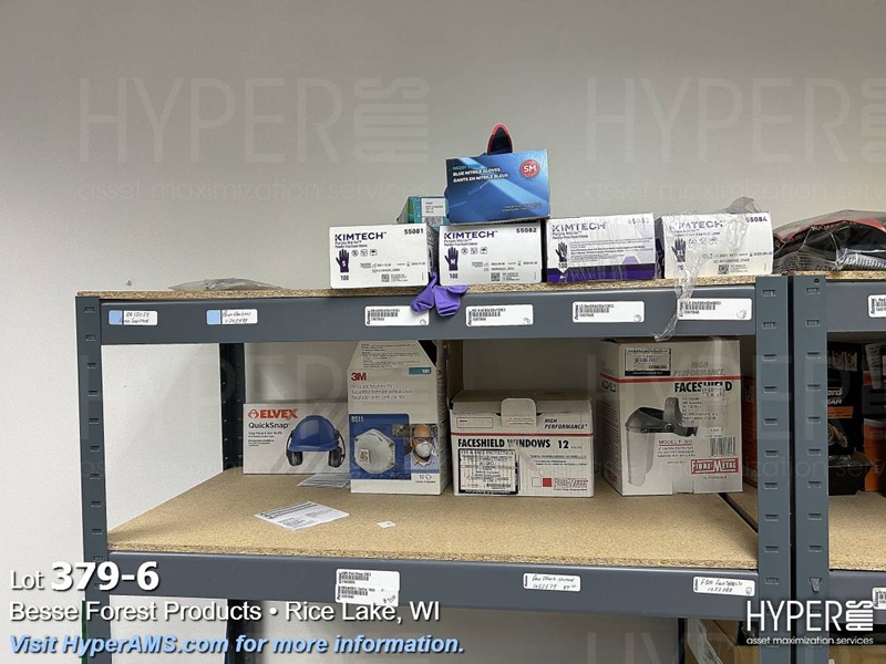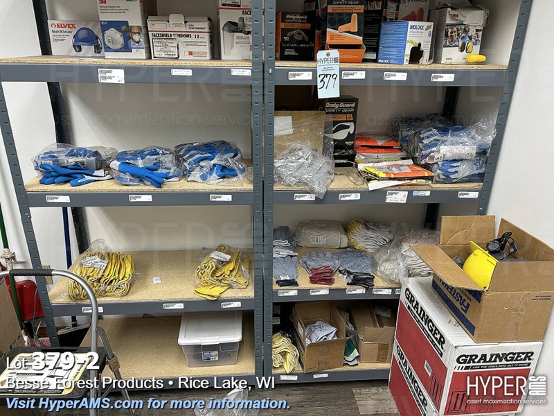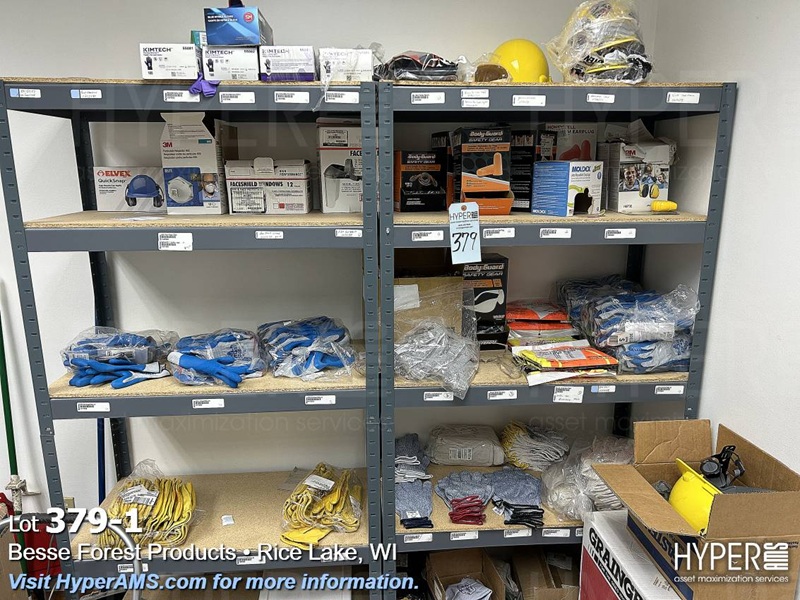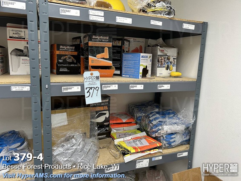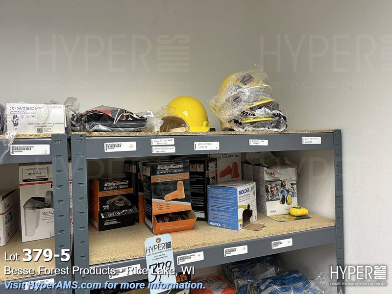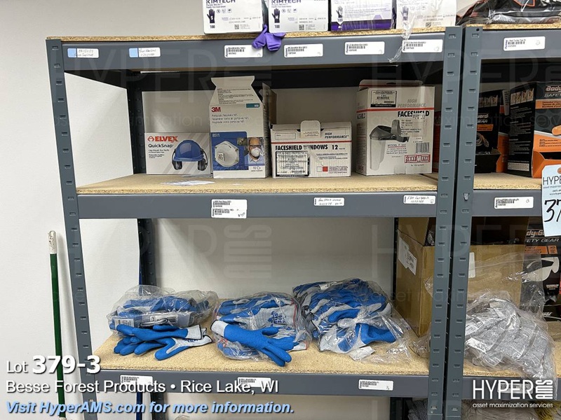 (2) SHELF UNITS (18" X 36" X 72" AND (2) GRANGER BOXES WITH CONTENTS-GLOVES, HARD HATS, EAR MUFFS, MASKS, FACE SHIELDS, EAR PLUGS, SAFETY VESTS
