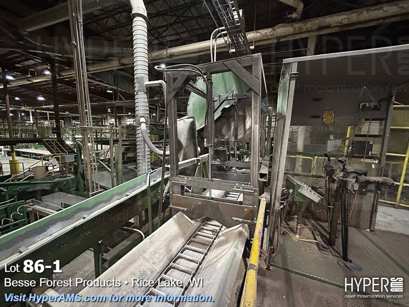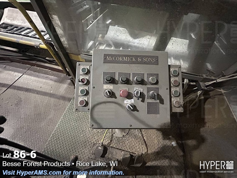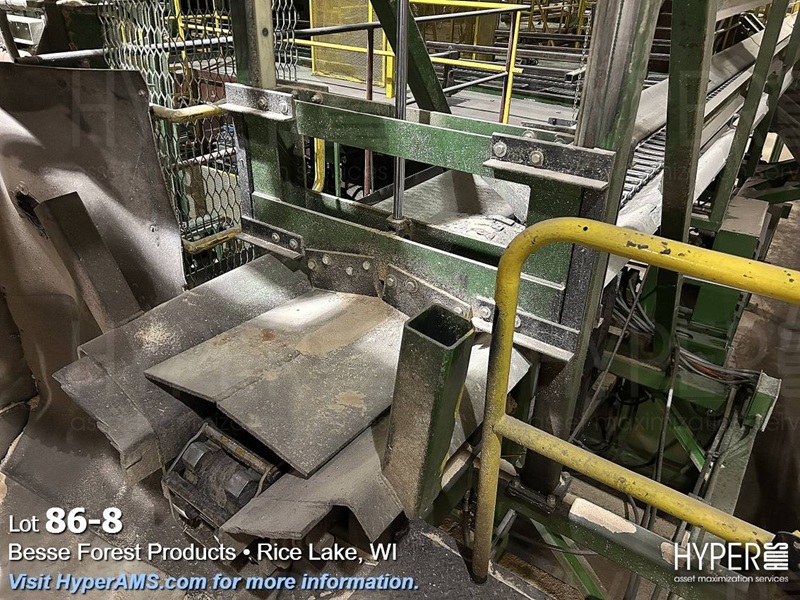 MOBARK CUT OFF SAW, 84" BLADE, CARBIDE, 75 HP, 1/2" KERF, INFEED CONVEYOR (SLIDE LEFT/RIGHT AND UP/DOWN) OUTFEED CONVEYOR (SLIDES LEFT/RIGHT) LOG HOLD DOWN CLAMPS ON INFEED/OUTFEED, WITH HYDRAULIC UNIT WITH TWIN 25HP PUMPS