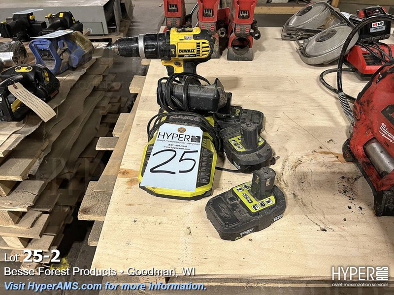 DEWALT DRILL, CHARGER, BATTERY; RYOBI CHARGER, AND BATTERIES