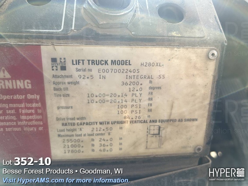 HYSTER H280XL 25,000LB CAP. FORKLIFT, 175" TALL MAST, 94" FORKS, SIDE SHIFT, S/N E0070022405
