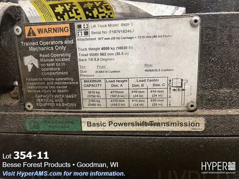 HYSTER 6000LB FORKLIFT, MODEL S60FT, 4' FORKS, 12641HR, LP, 3 STAGE MAST, SIDE SHIFT, S/N F18718246J