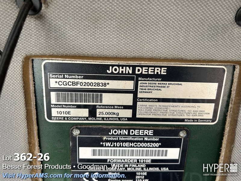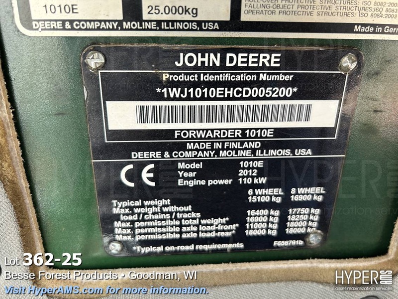 JOHN DEER 1010E FORWARDER PRODUCTION * 1WJ1010EHCD005200*, S/N *CGCBF02002888*