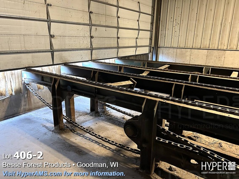 BOARD STACKING LINE CONSISTING OF-4 CHAIN BOARD DECK 125"X30', (2) UNSCRAMBLE INCLINES (6 CHAIN, 9' EACH), (1) LOAD INCLINE (6 CHAIN), 5 CHAIN (1 CHAIN MISSING) BOARD DECK 27', SPACER INSERT STATION WITH SCISSOR LIFT ROLLER CONVEYOR AND LIFT STATION FOR S