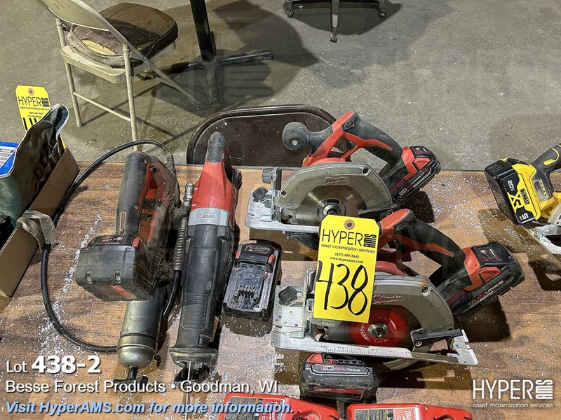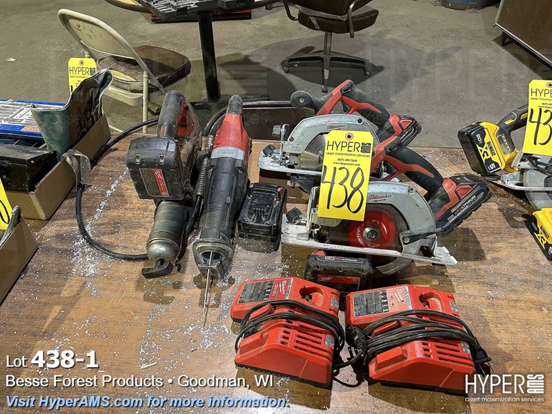 (4) MILWAUKEE M18 BATTERY TOOLS (2 CIRCULAR SAW, (1) RECIP SAW, (1) GREASE GUN}, (2) CHARGERS, (4) BATTERIES