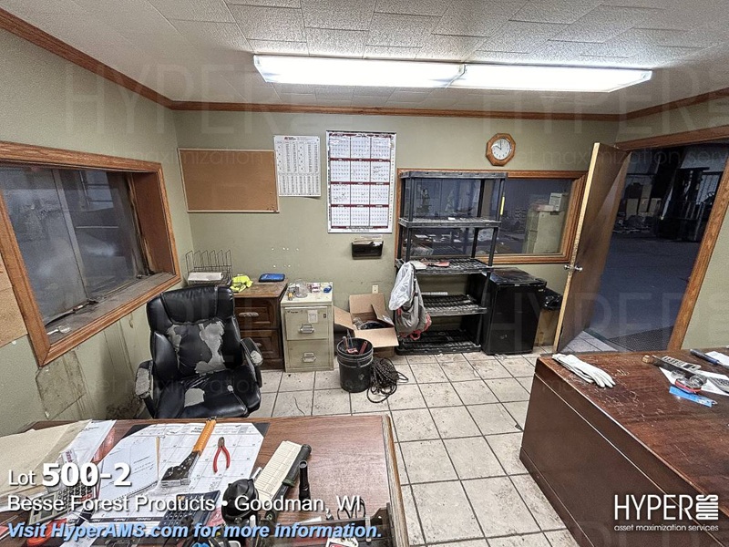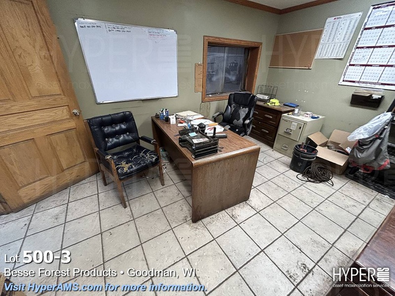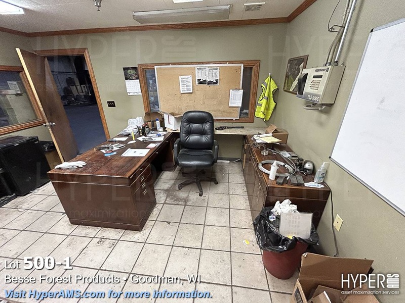 2 DESKS, CREDENZA, (2) FILE CABINETS, (3) CHAIRS, SHELF UNIT, FRIDGE