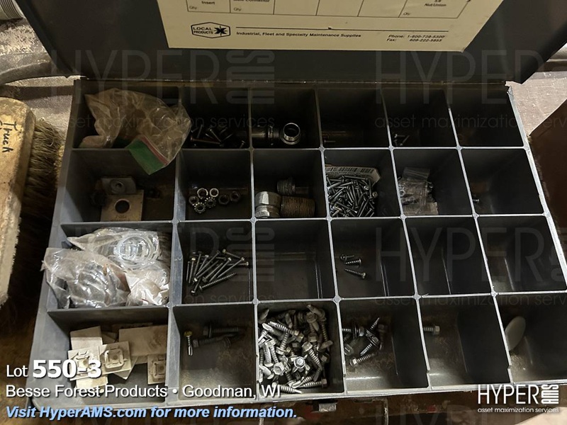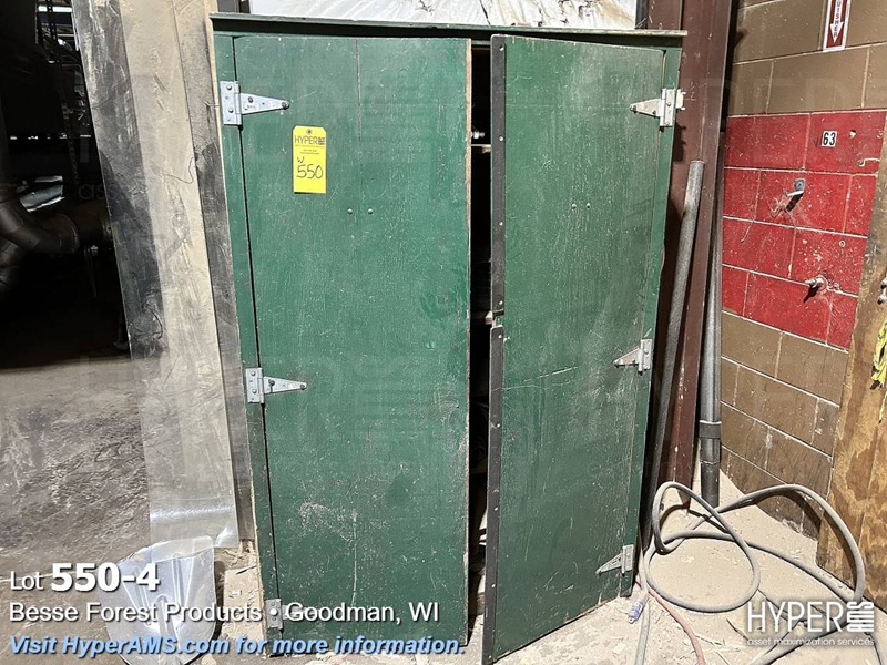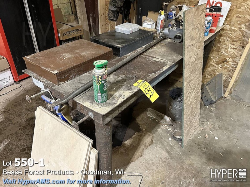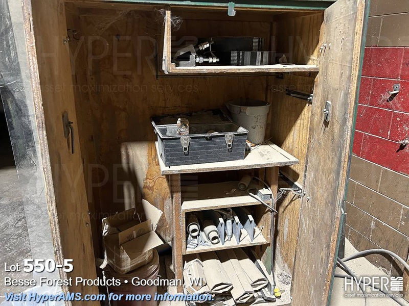 STEEL TABLE WITH CONTENTS, SMALLER LOCKER, 2 DOOR WOOD CABINET