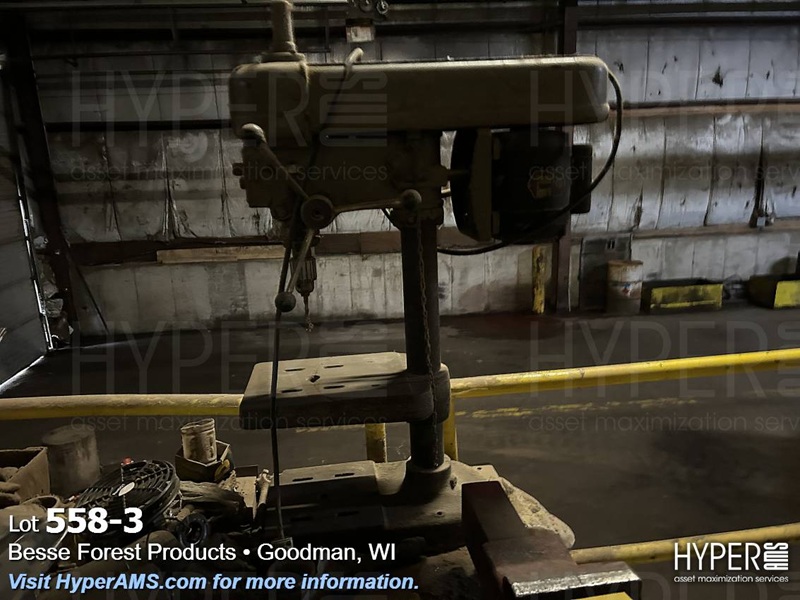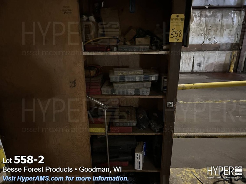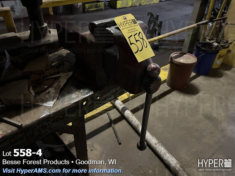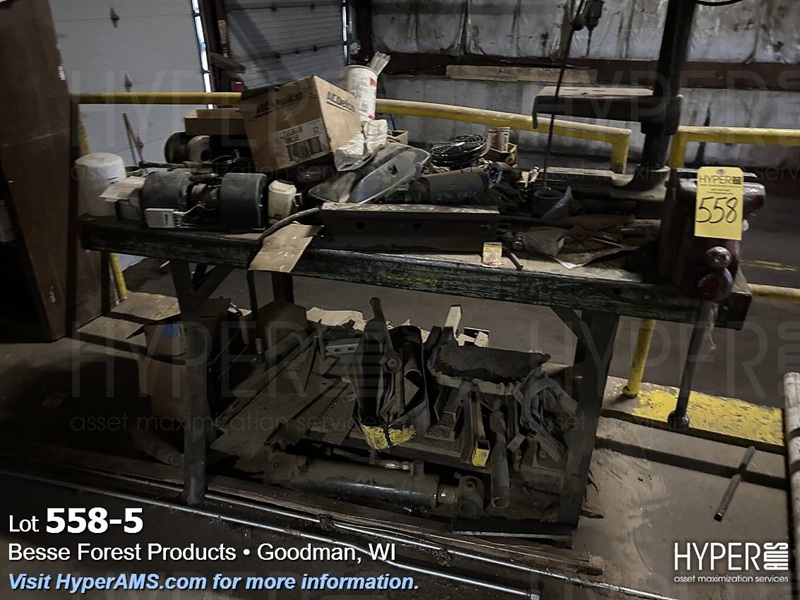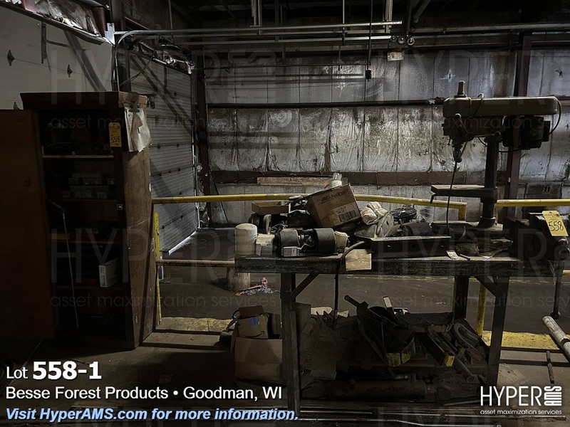STEEL TABLE WITH 6" VISE, BENCH DRILL, PRESS AND WOOD CABINET WITH CONTENTS