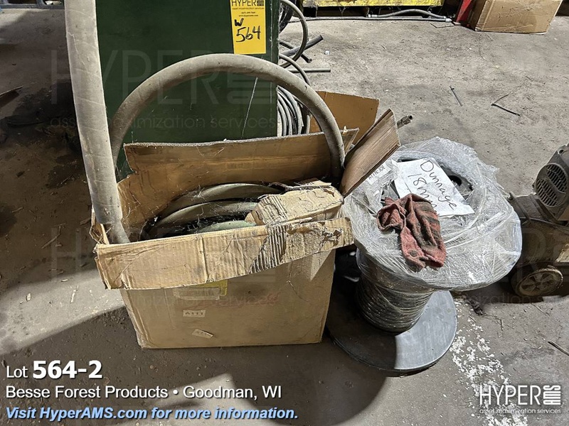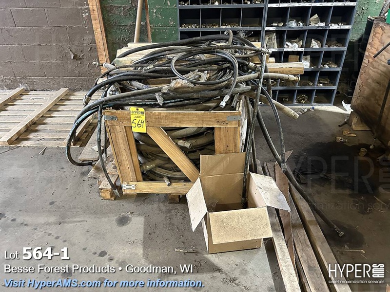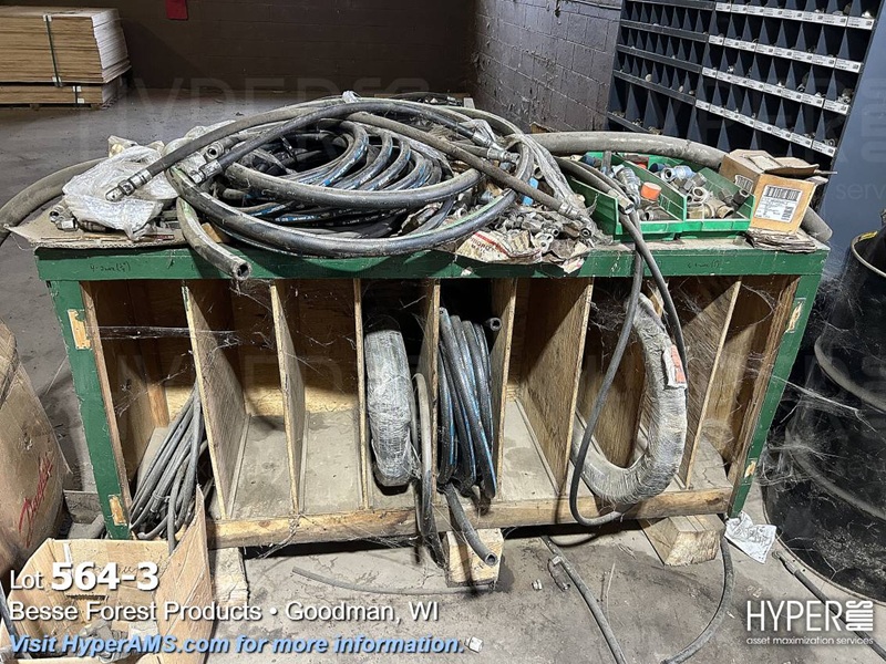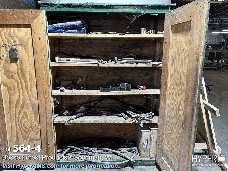HYDRAULIC HOSES AND MISC. FITTINGS IN WOOD BOX, WOOD SHELF UNIT, WOOD 2 DOOR CABINET