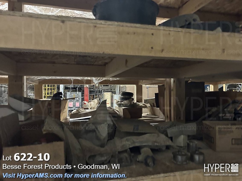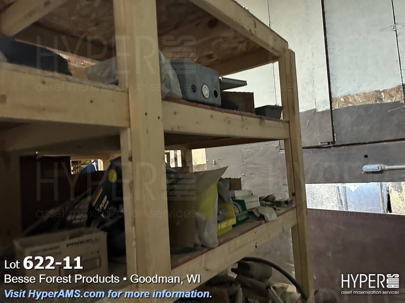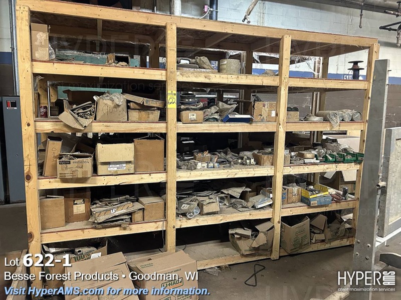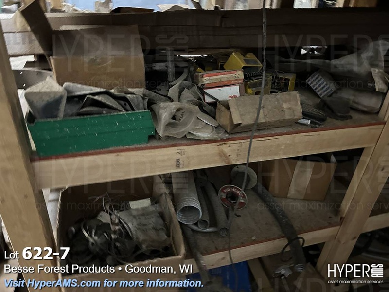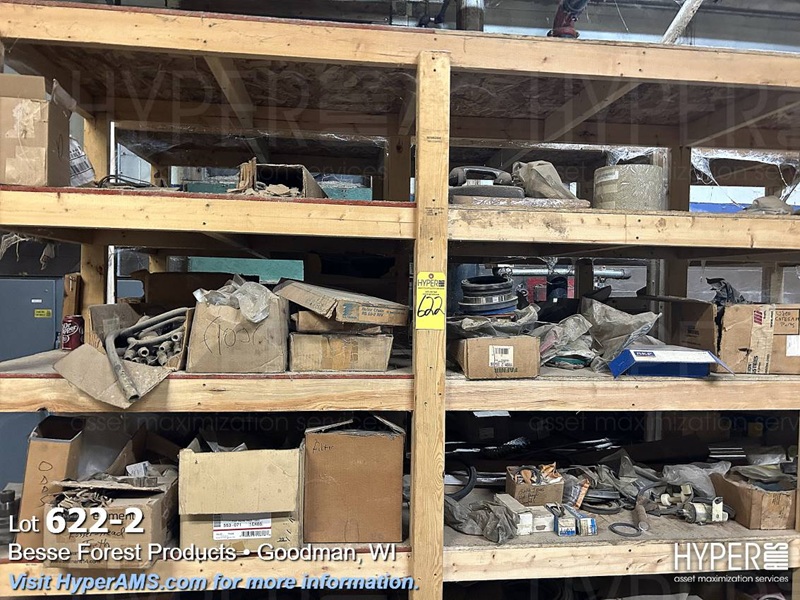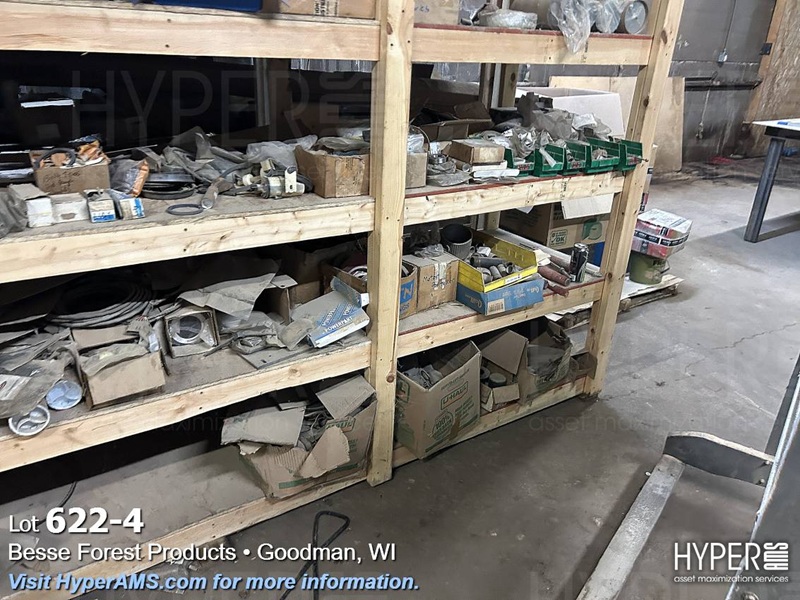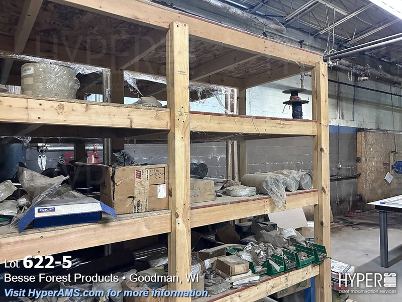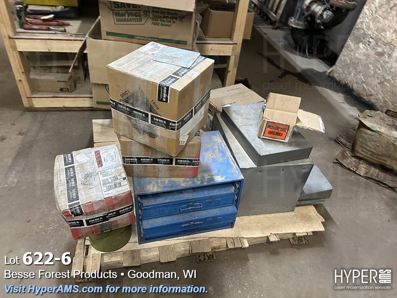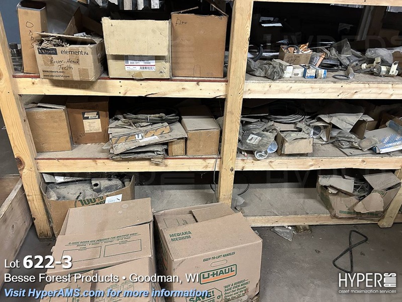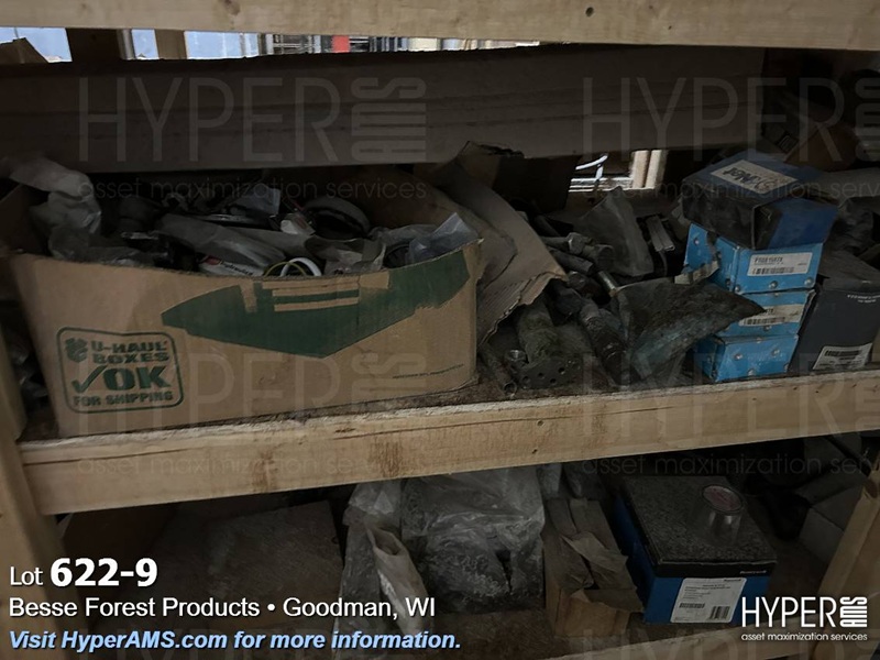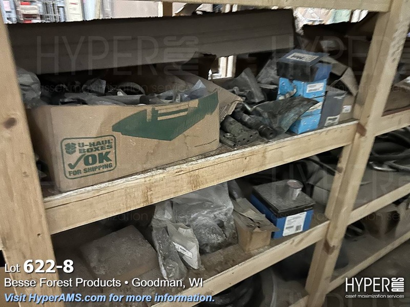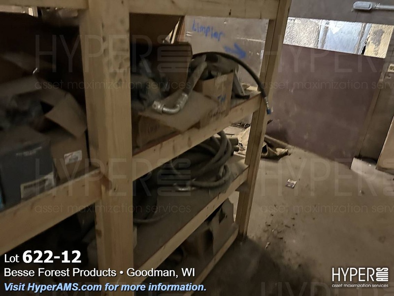 WOOD SHELF WITH FILTERS, FITTINGS. HYDRAULIC CYLINDERS AND SKID WITH PARTS CABINETS