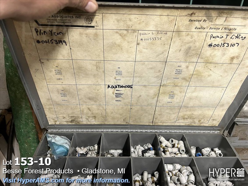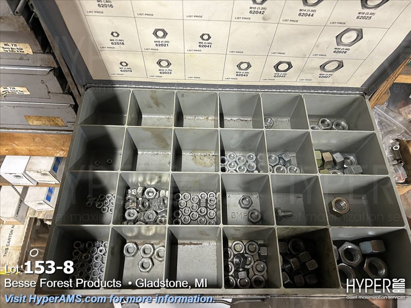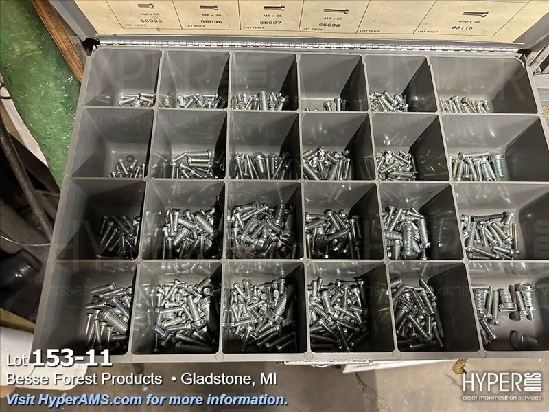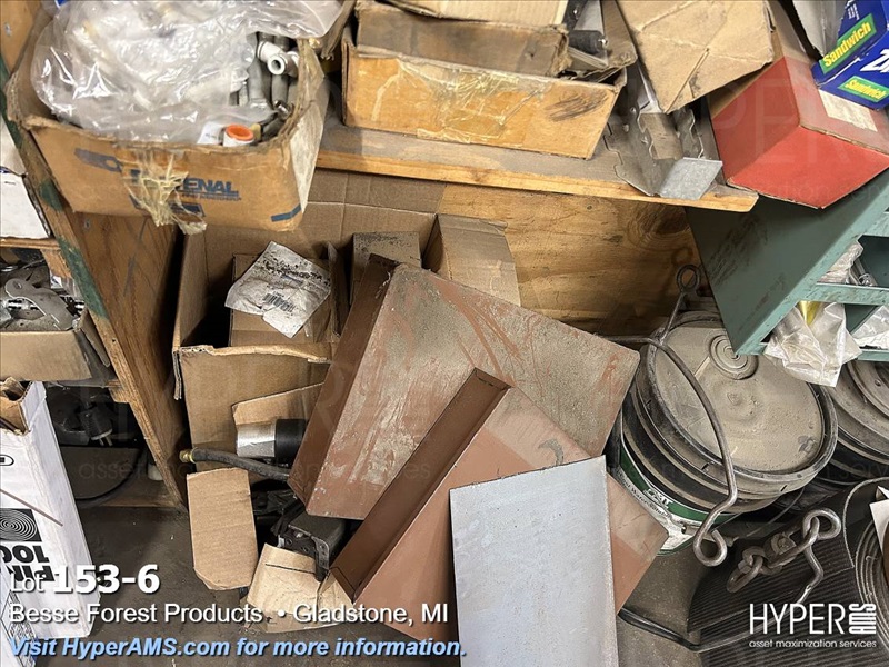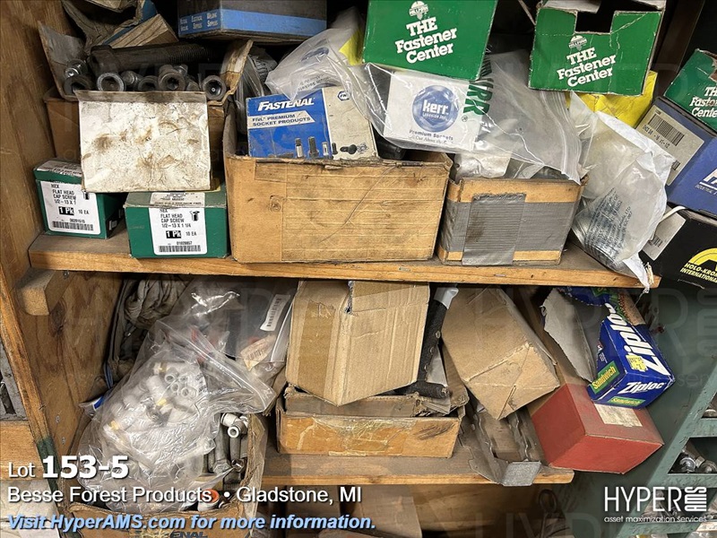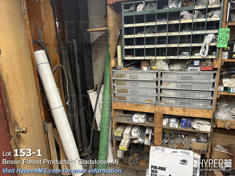 CONTENTS ON WOOD SHELVES-2-4 DRAWER FASTNER CABINETS, 40 HOLE PARTS BIN, ASSORTED FASTNERS IN BOXES, BELT CLIPS, METAL IN CORNER, ETC.