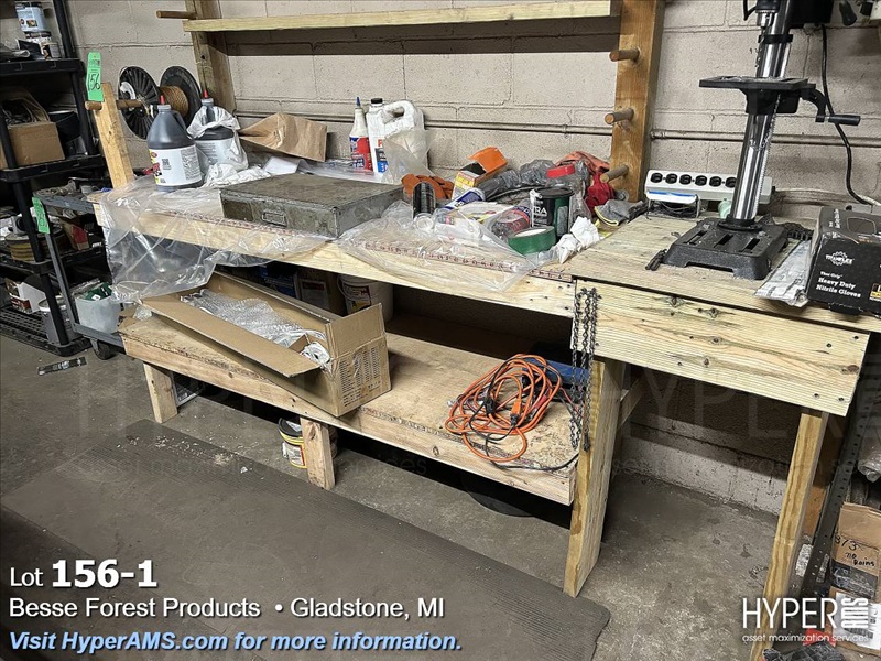 WOOD BENCH 2'X6' WITH CONTENTS-CORDS, BOX OF FASTNERS, 2 GALLONS CRACK FILLER, ETC.