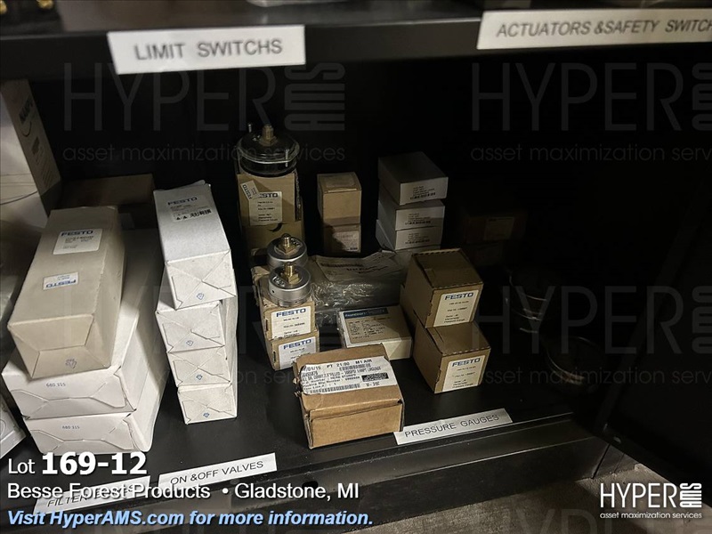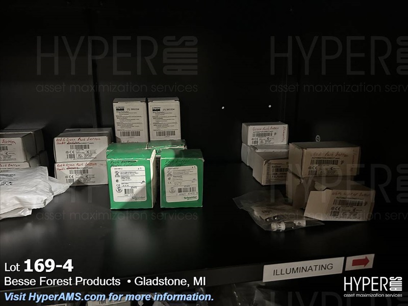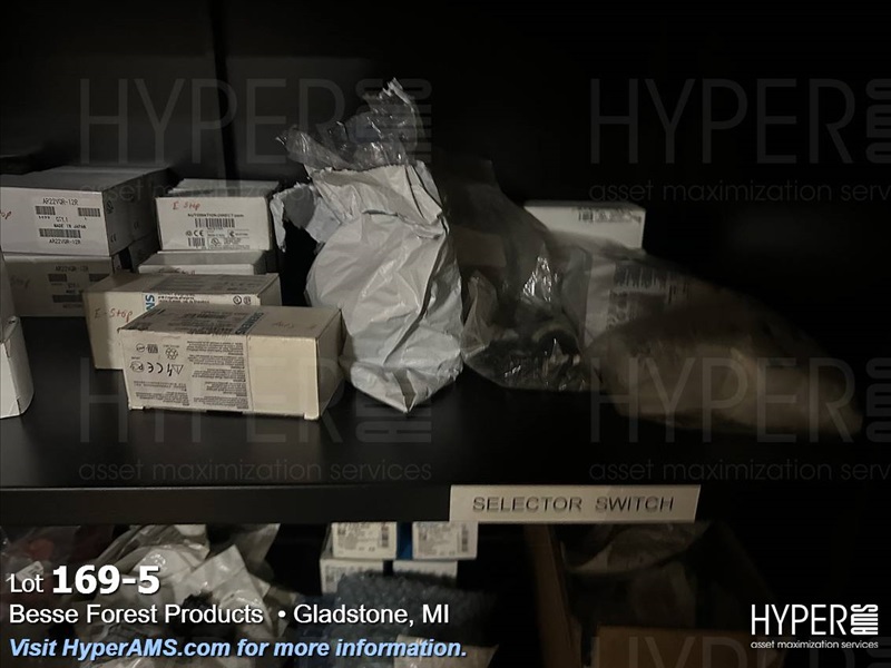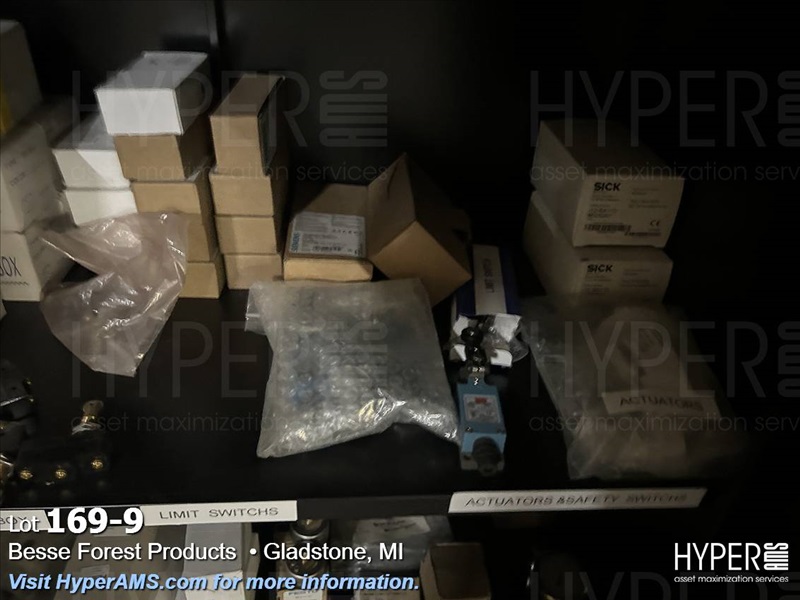 2 DOOR CABINET WITH MACHINE REPAIR PARTS-BUTTONS, EMERGENCY STOPS, CONNECTORS, SAFETY RELYS, LIMIT SWITCHESD