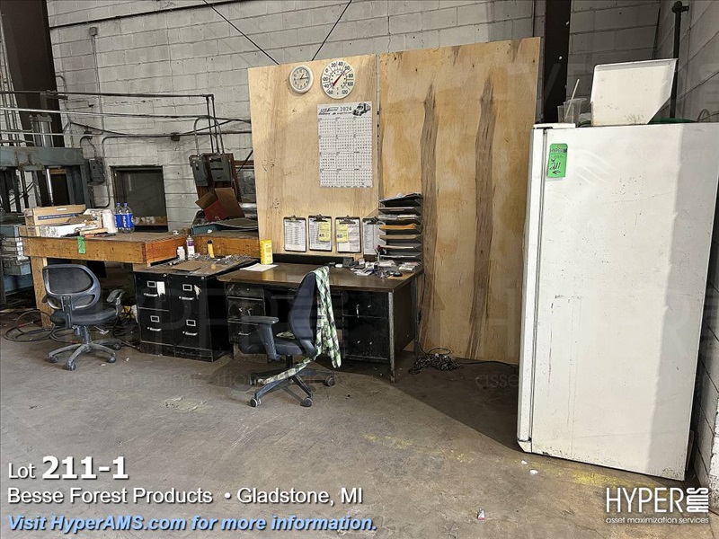 REFRIGERATOR, (2) 2 DRAWER FILES, DESK, (2) CHAIRS, WOOD BENCH