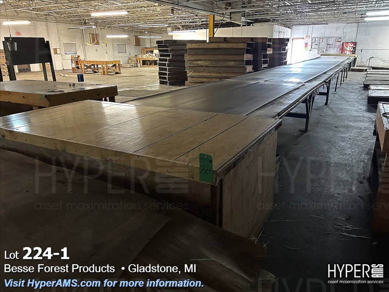 BELT LINE TABLE 7'XAPPX. 90', (2) WOOD TABLES 54"X106", SCISSOR LIFT 42"X8'
