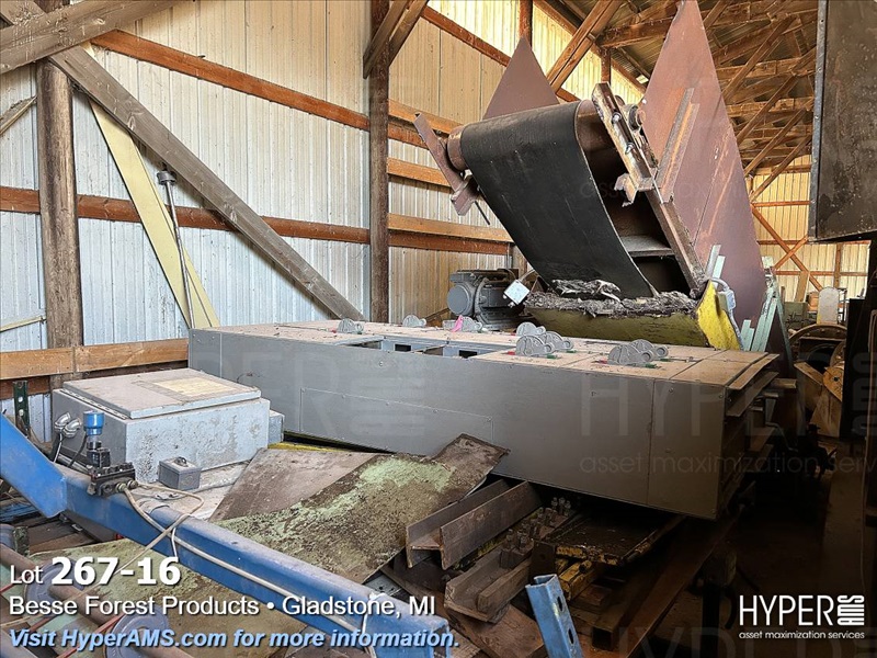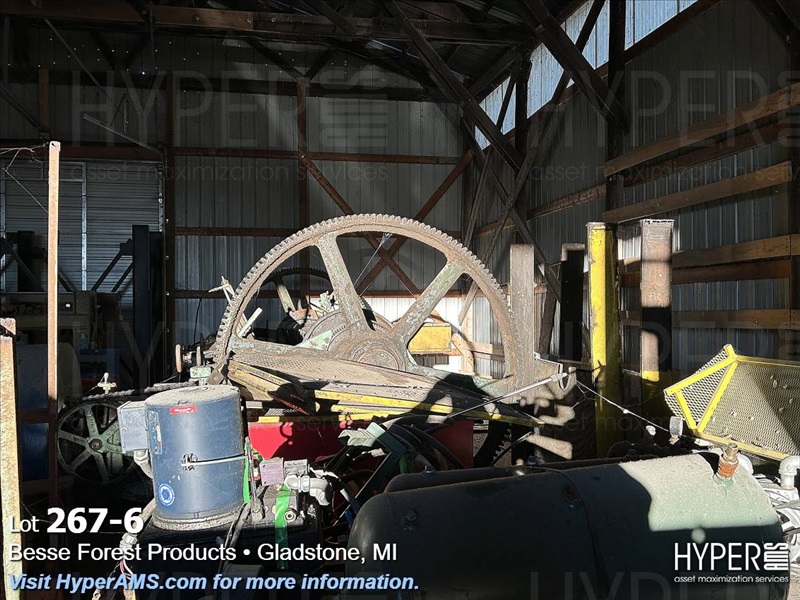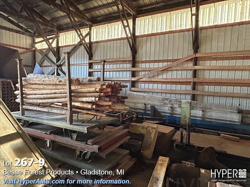 ASSORTED MACHINES AND PARTS IN BUILDING-VINEER COMPRESS PRESSE, 1/2 ROUND ALTHE, CONVEYOR, PALLET TRUCK, 24" CONVEYOR, (EXCLUDES LOT 260 BOILER PARTS AND LOTS 264 THRU 266)