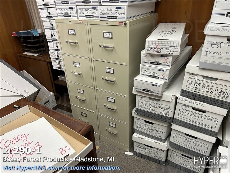 WOOD DESK WITH LEFT-HAND RETURN, WOOD CABINET, 2 FOUR DRAWER FILING CABINET